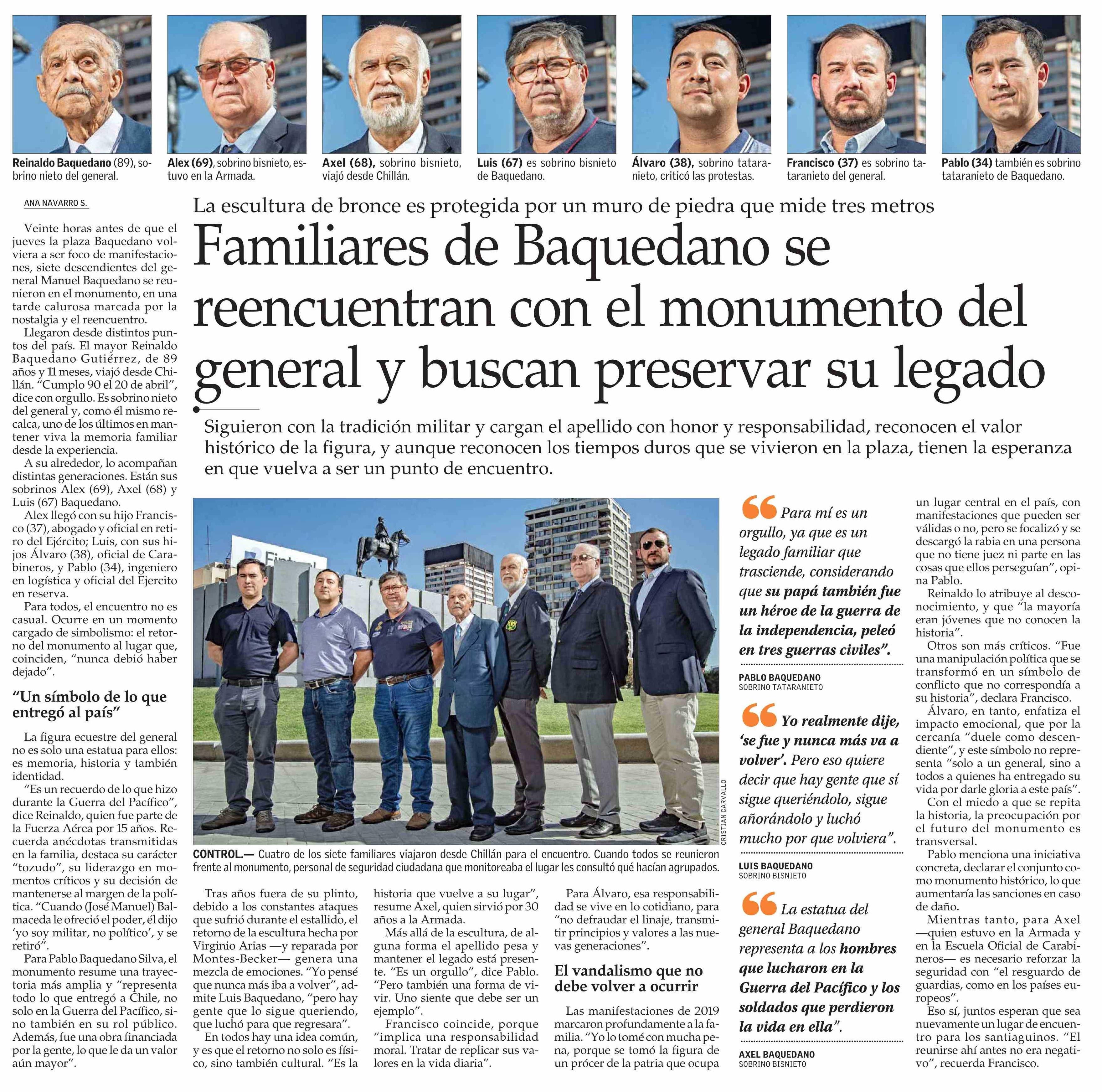 Familiares de Baquedano se reencuentran con el monumento del general y buscan preservar su legado 29-03-2026 El Mercurio |