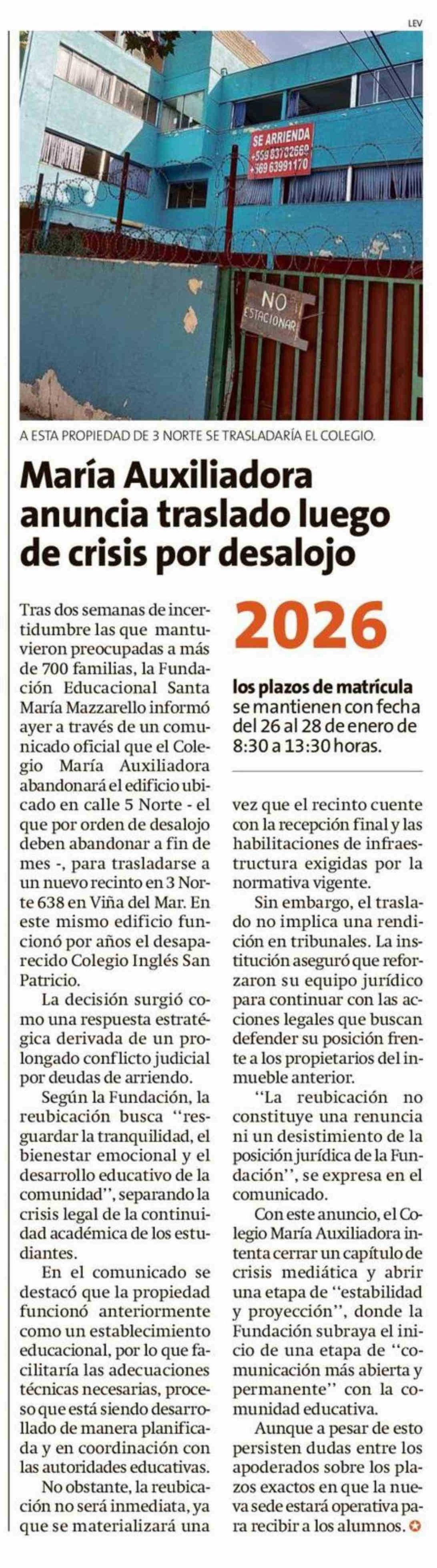 María Auxiliadora anuncia traslado luego de crisis por desalojo 24-01-2026 La Estrella de Valparaíso |