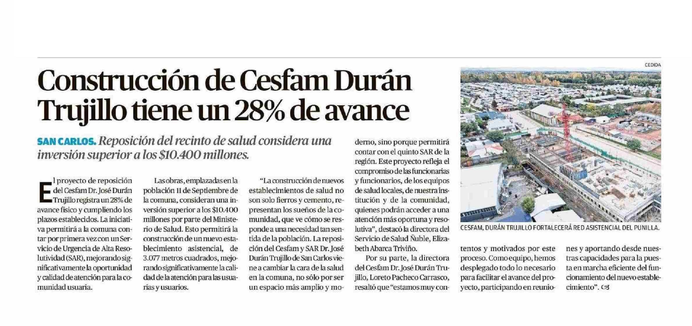Construcción de Cesfam Durán Trujillo tiene un 28% de avance Trujillo tiene un 28% de avance 05-06-2025 Crónica de Chillán |