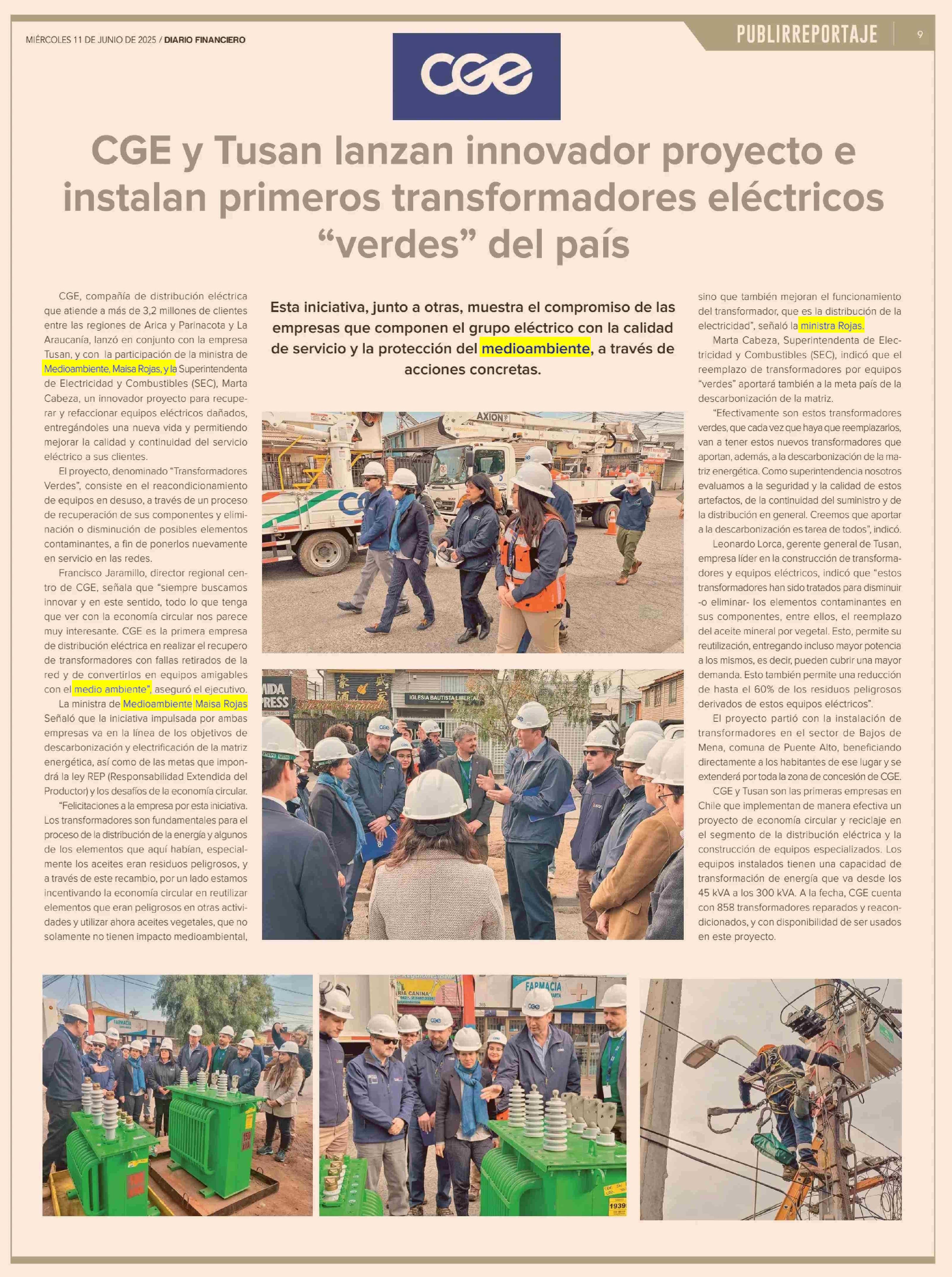 Título: CGE y Tusan lanzan innovador proyecto e instalan primeros transformadores eléctricos “verdes” del país