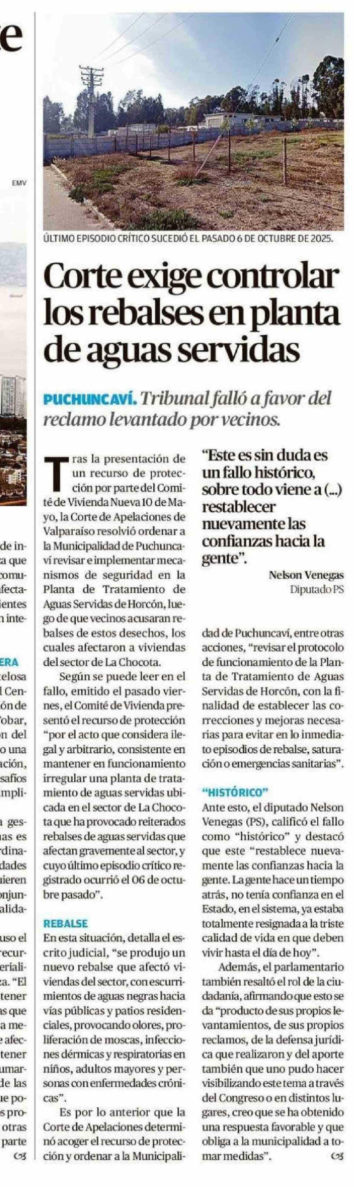 Corte exige controlar los rebalses en planta de aguas servidas 12-01-2026 El Mercurio de Valparaíso |