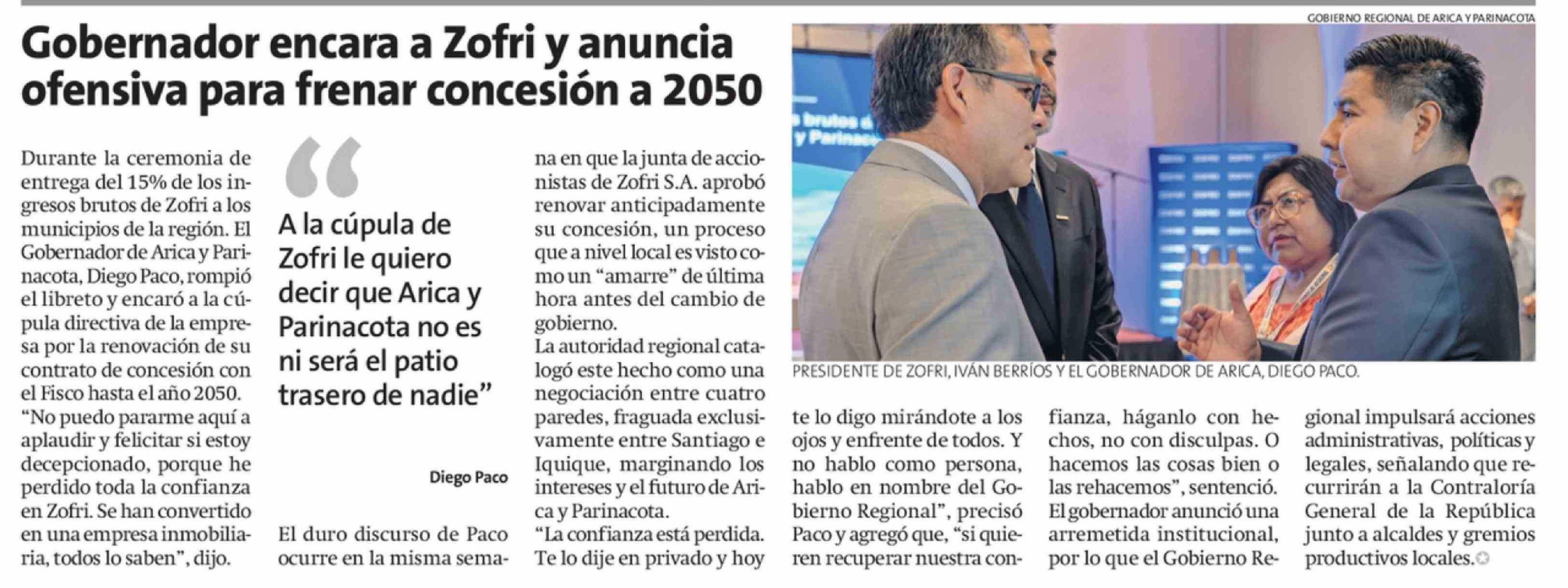 Gobernador encara a Zofri y anuncia ofensiva para frenar concesión a 2050 21-02-2026 La Estrella de Arica |
