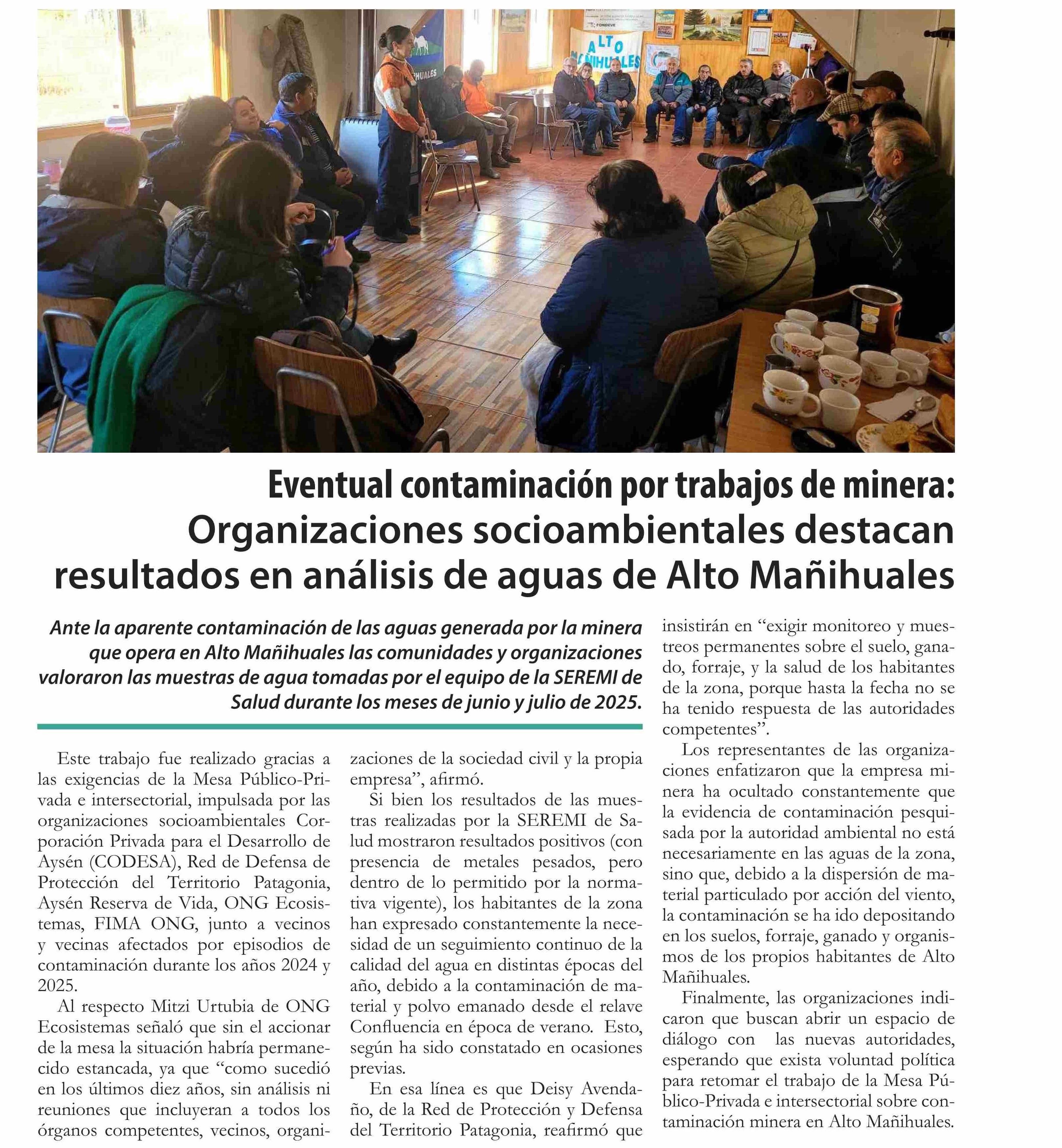 Título: Eventual contaminación por trabajos de minera: Organizaciones socioambientales destacan resultados en análisis de aguas de Alto Mañihuales