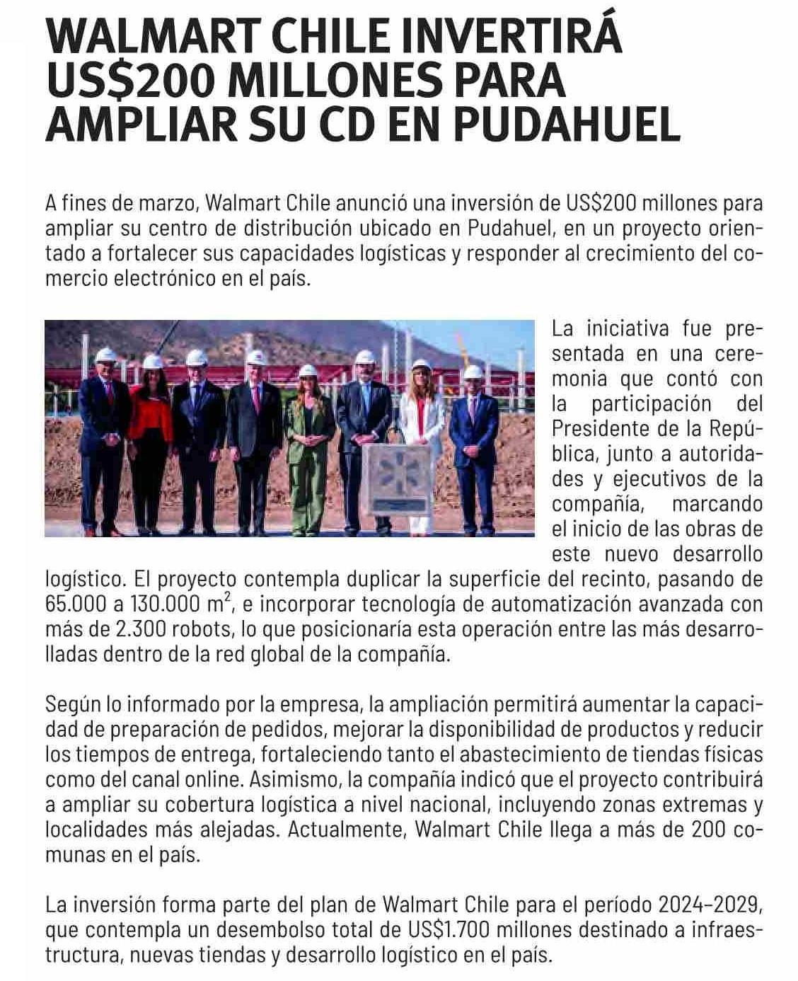 Título: WALMART CHILE INVERTIRÁ US$200 MILLONES PARA AMPLIAR SU CD EN PUDAHUEL