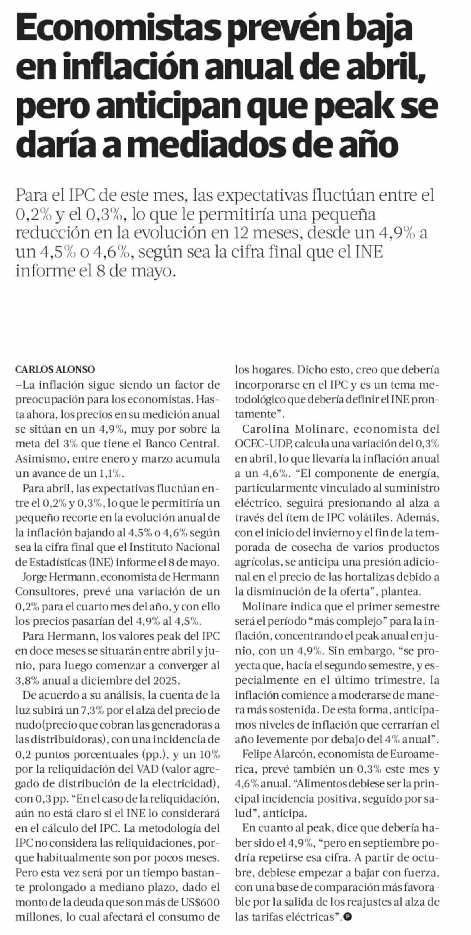Economistas prevén baja en inflación anual de abril, pero anticipan que peak se daría a mediados de año 28-04-2025 La Tercera |