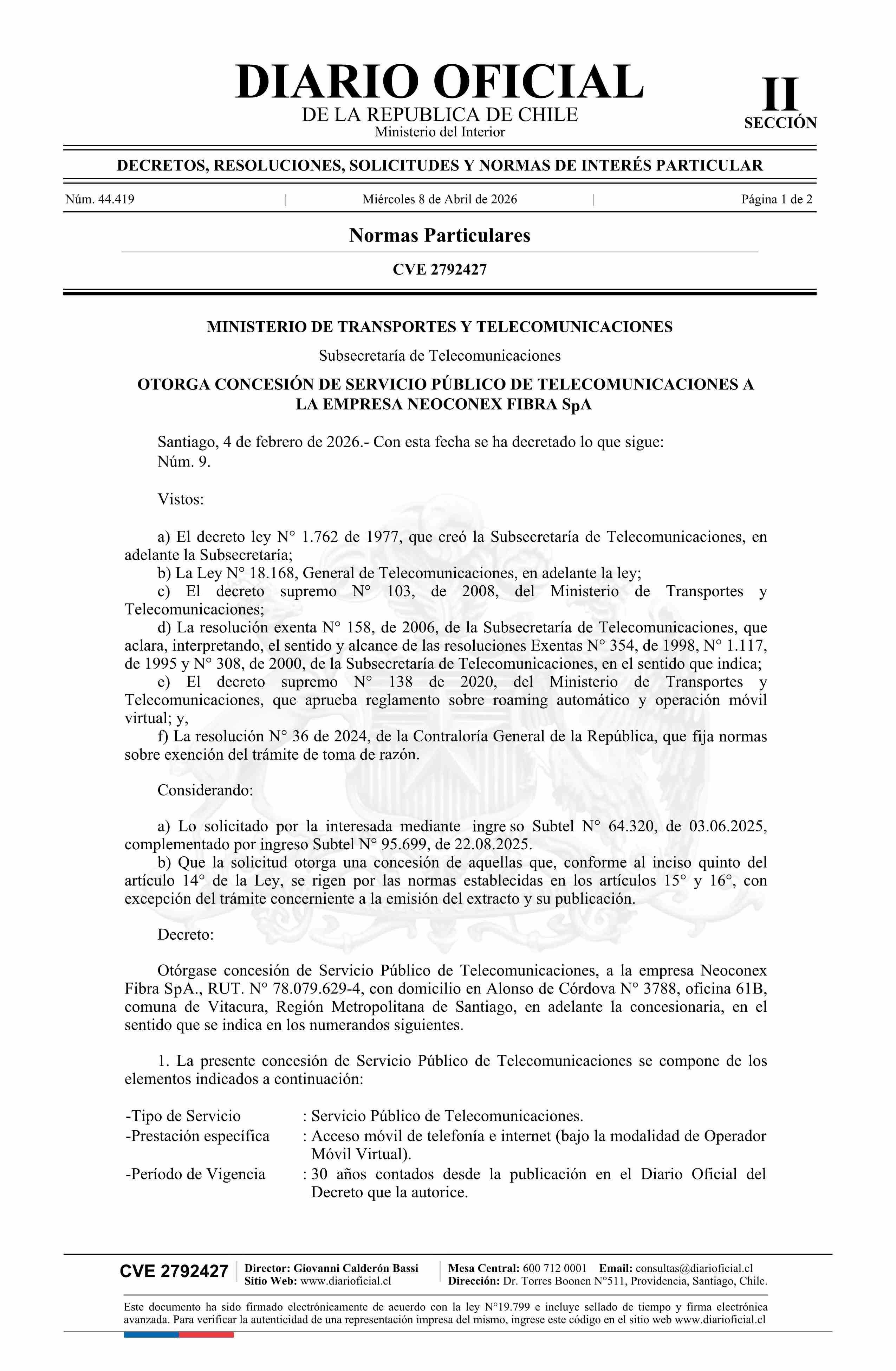 Decreto número 9, de 2026.- Otorga concesión de servicio público de telecomunicaciones a la empresa Neoconex Fibra SpA