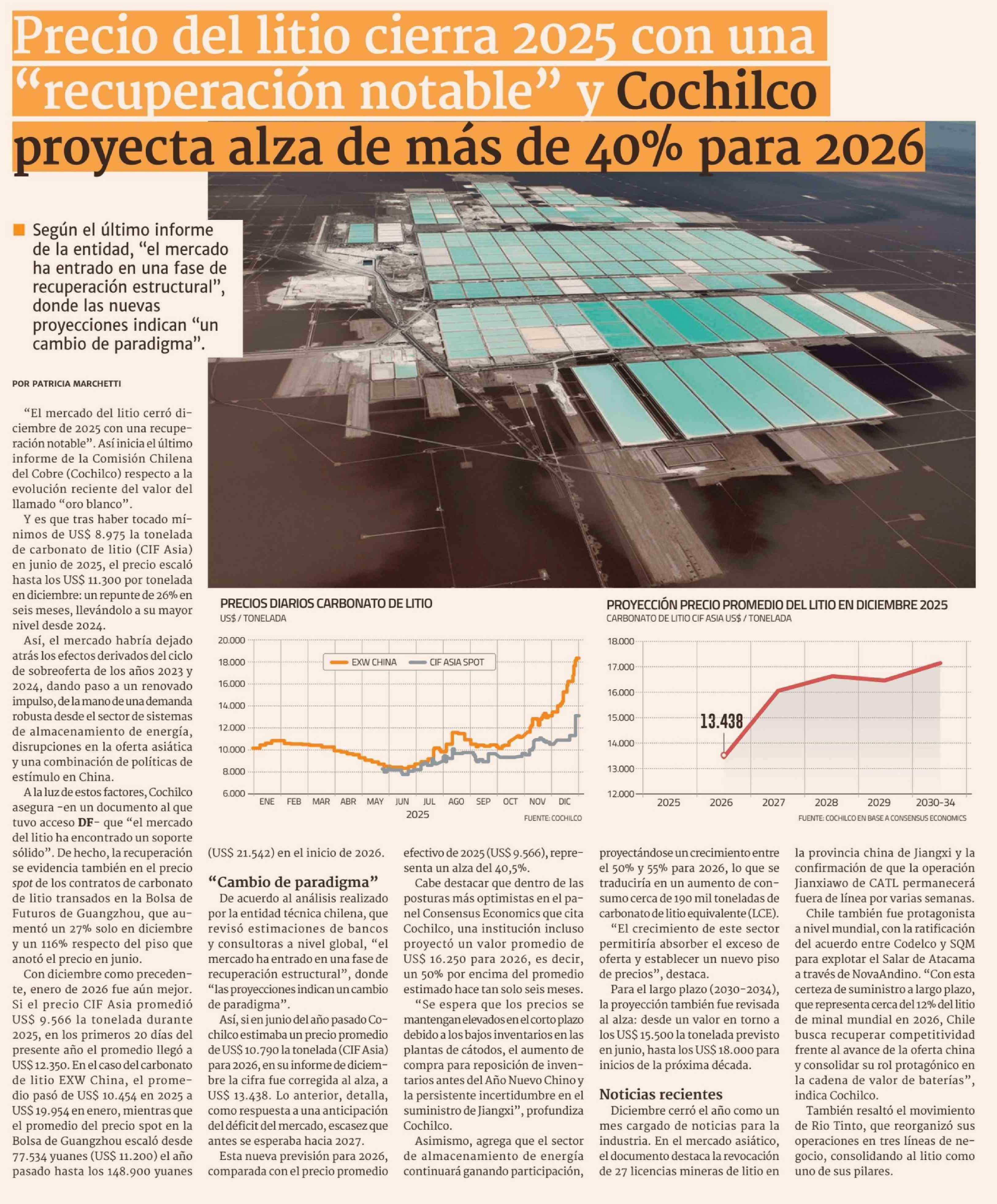 Precio del litio cierra 2025 con una "recuperación notable" y Cochilco proyecta alza de más de 40% para 2026 12-02-2026 Diario Financiero |
