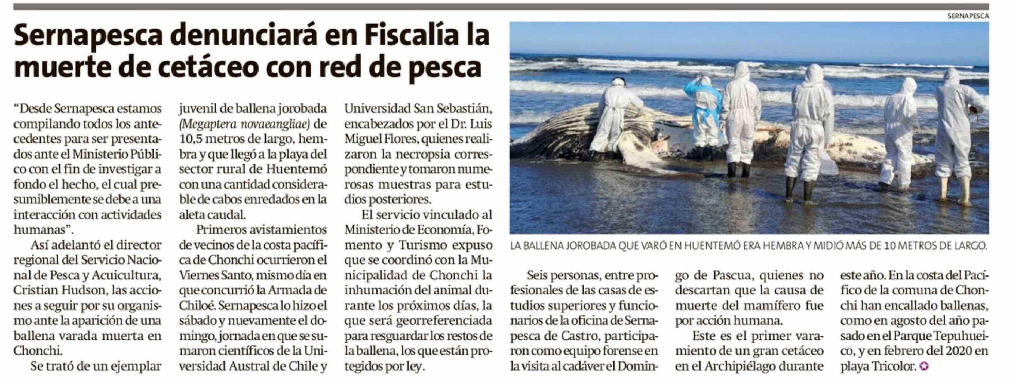 Título: Sernapesca denunciará en Fiscalía la muerte de cetáceo con red de pesca