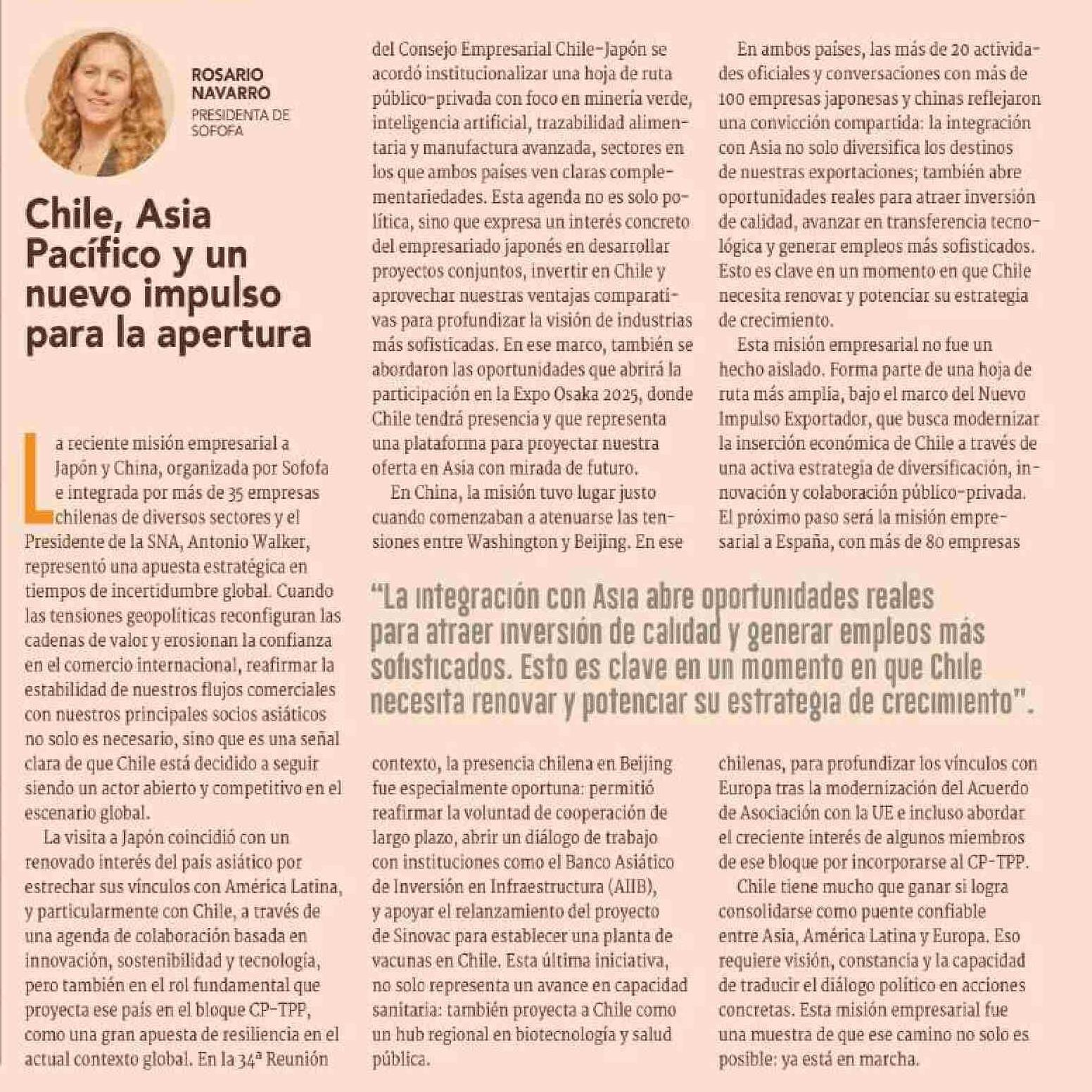 COLUMNAS DE OPINIÓN: Chile, Asia Pacífico y un nuevo impulso para la apertura 26-05-2025 Diario Financiero |