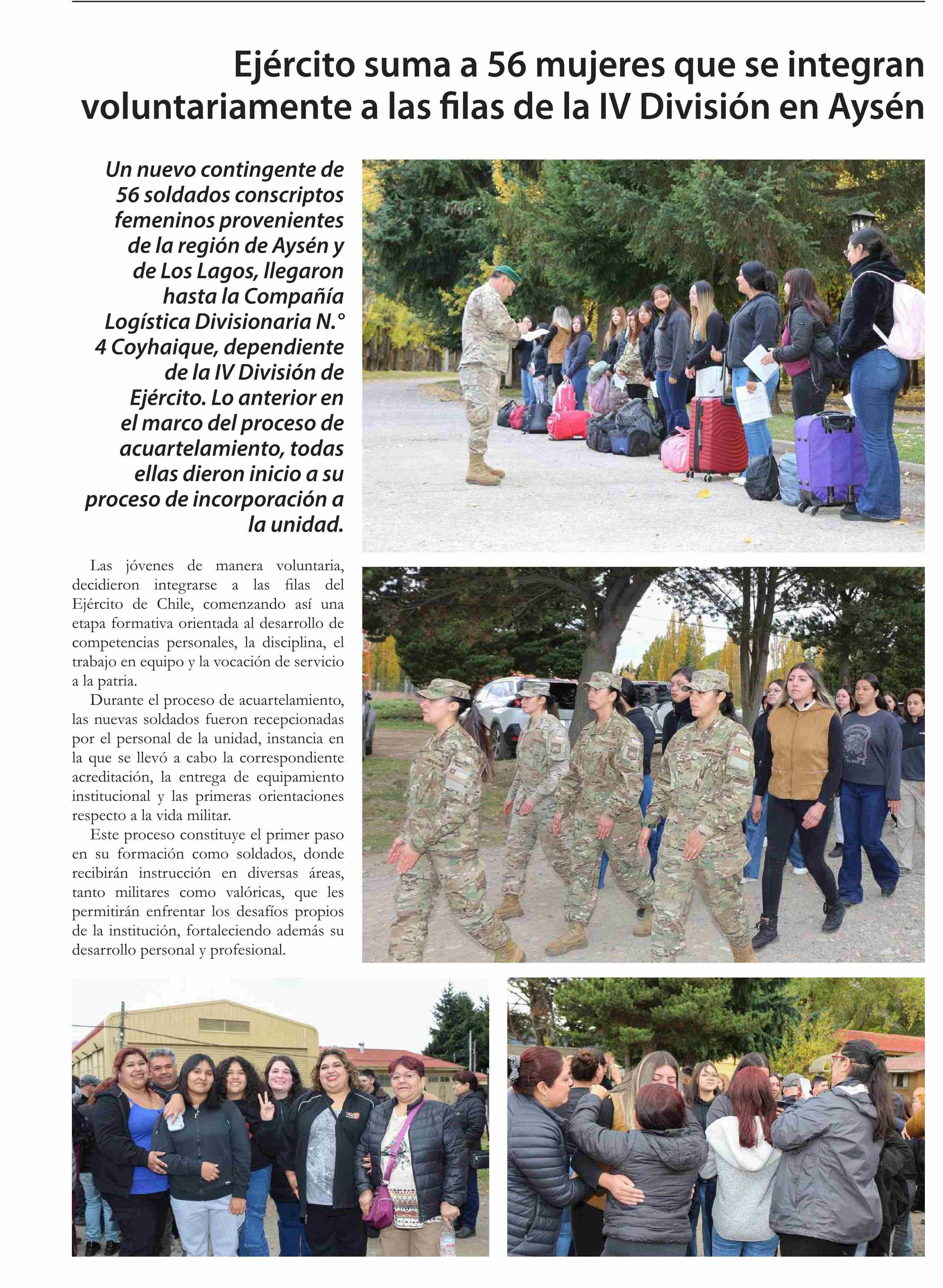 Ejército suma a 56 mujeres que se integran voluntariamente a las filas de la IV División en Aysén 14-04-2026 El Divisadero |