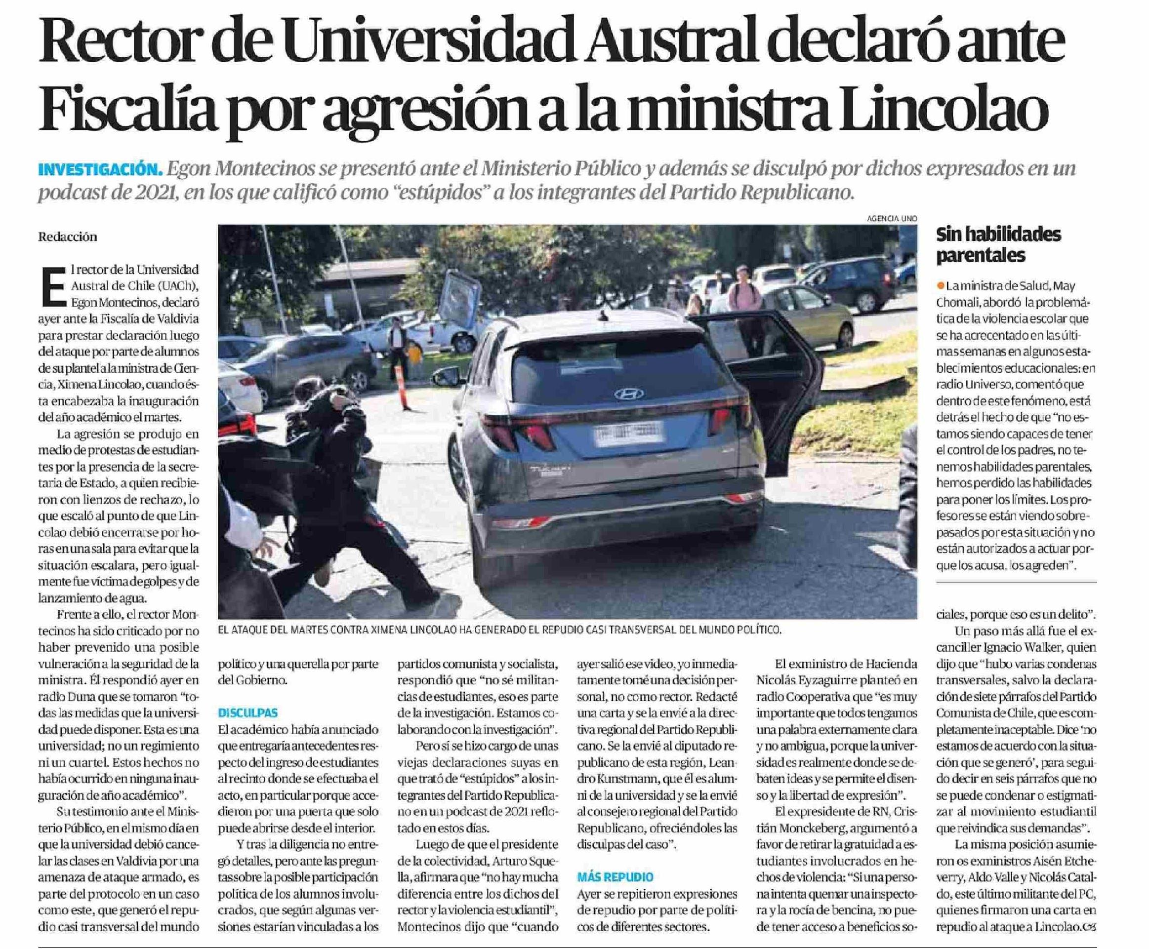 Rector de Universidad Austral declaró ante Eiscalía por agresión a la ministra Lincolao 11-04-2026 El Mercurio de Calama |