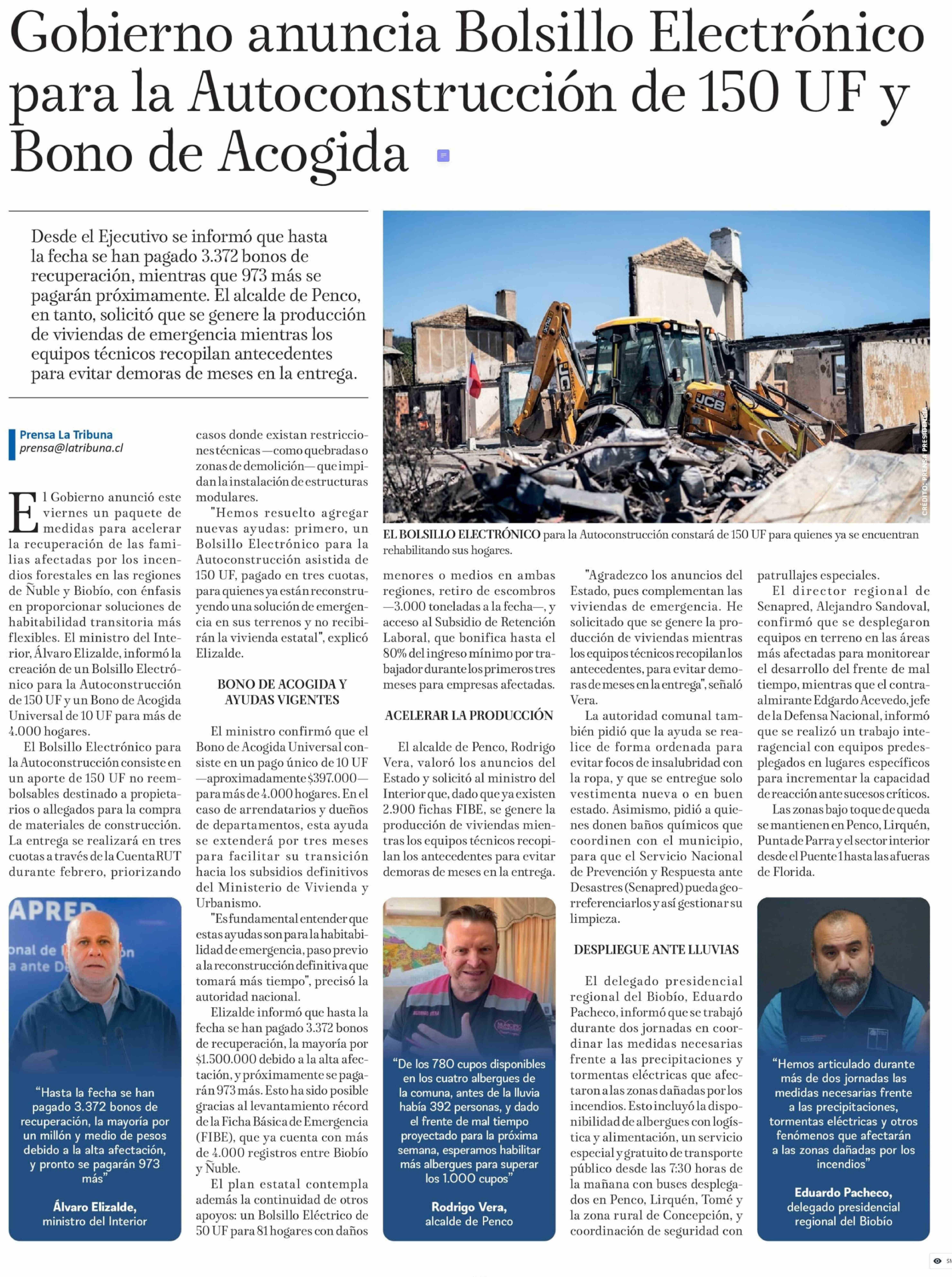 Gobierno anuncia Bolsillo Electrónico para la Autoconstrucción de 150 UF y Bono de Acogida 31-01-2026 La Tribuna |