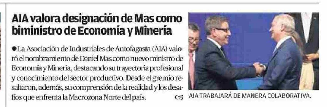 AIA valora designación de Mas como biministro de Economía y Minería 22-01-2026 El Mercurio de Calama |