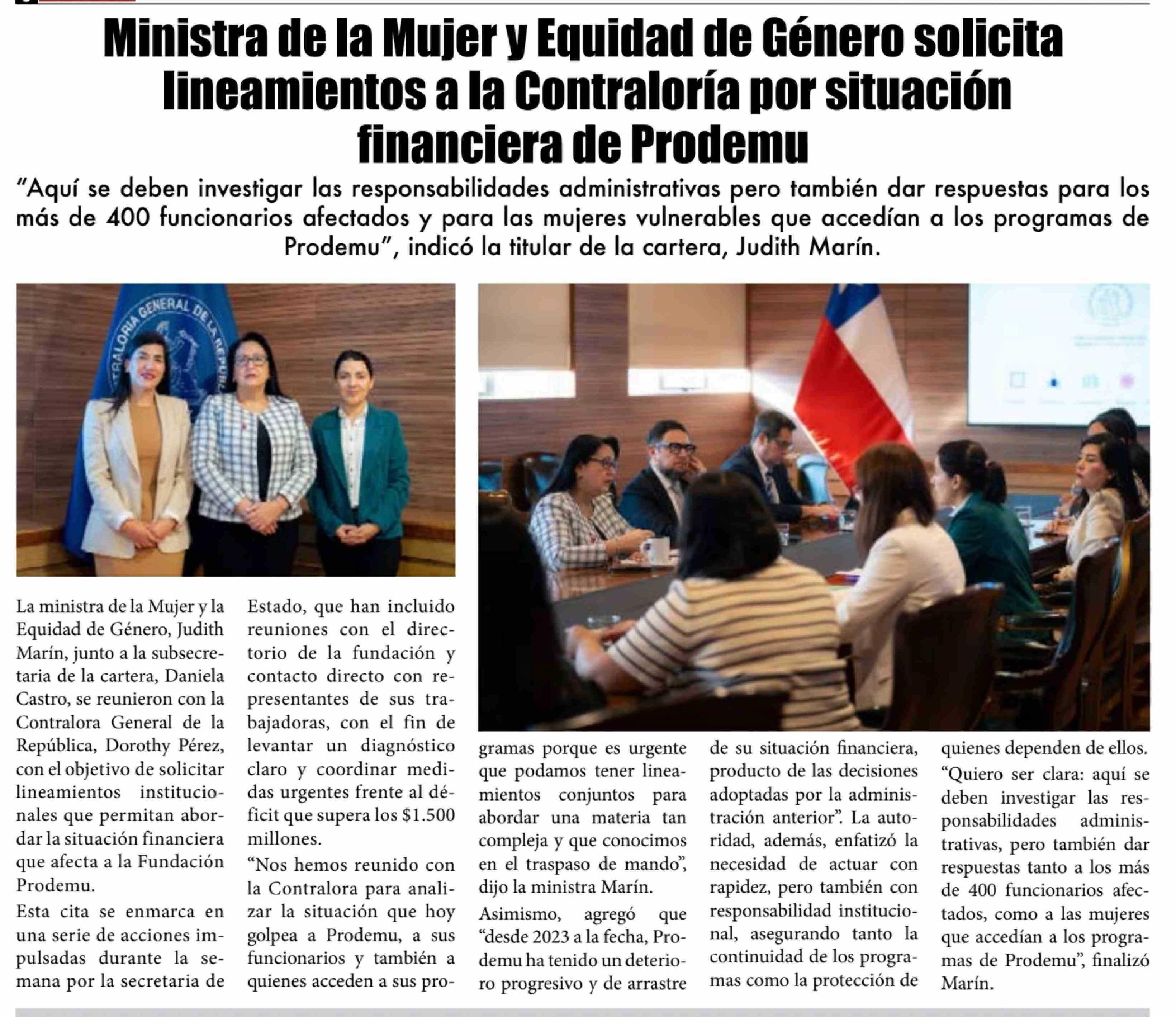 Título: Ministra de la Mujer y Equidad de Género solicita lineamientos a la Contraloría por situación financiera de Prodemu