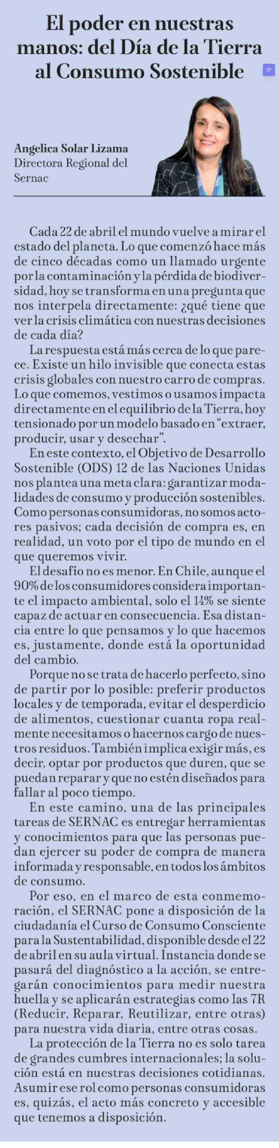 Columnas de Opinión: El poder en nuestras manos: del Día de la Tierra al Consumo Sostenible 24-04-2026 La Tribuna |