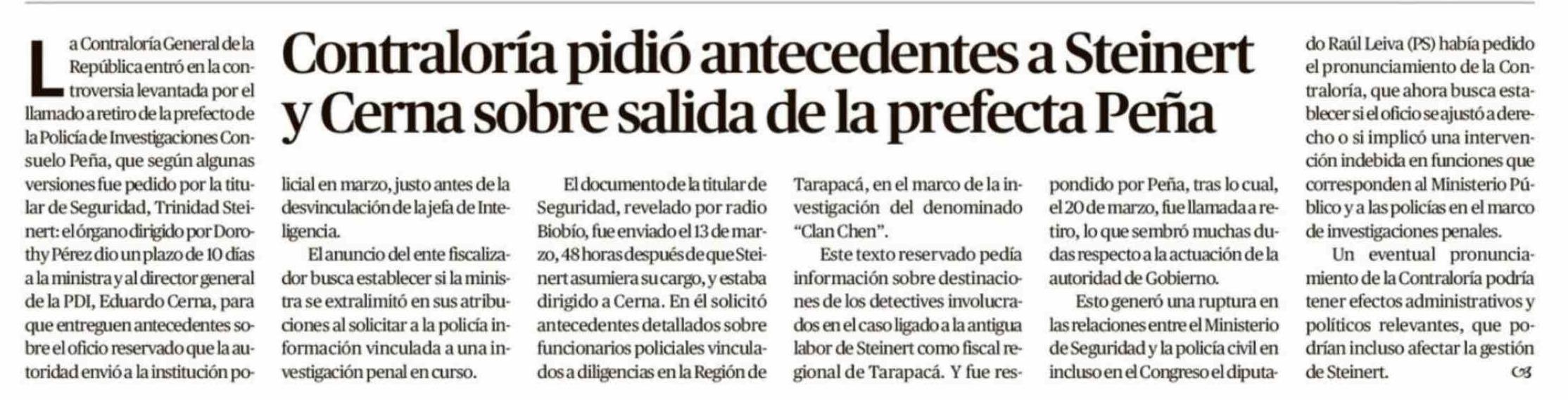 | Título: | Contraloría pidió antecedentes a Steinert y Cerna sobre salida de la prefecta Peña |