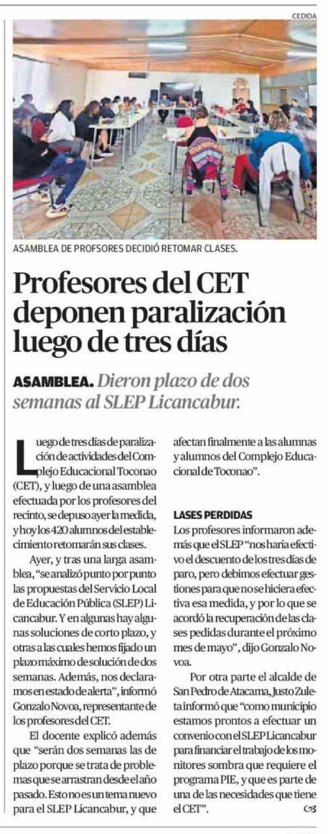 Profesores del CET deponen paralización luego de tres días 23-04-2026 El Mercurio de Calama |