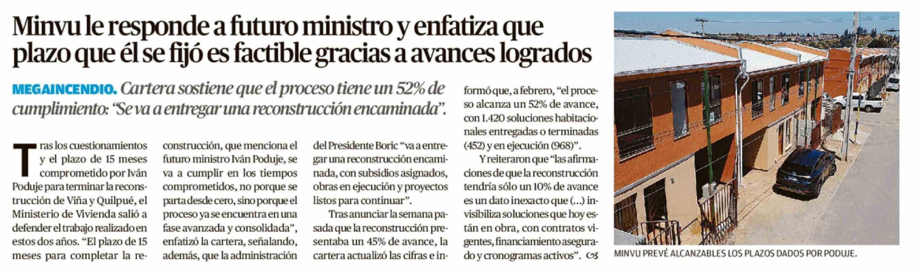 Título: Minvu le responde a futuro ministro y enfatiza que plazo que él se fijó es factible gracias a avances logrados