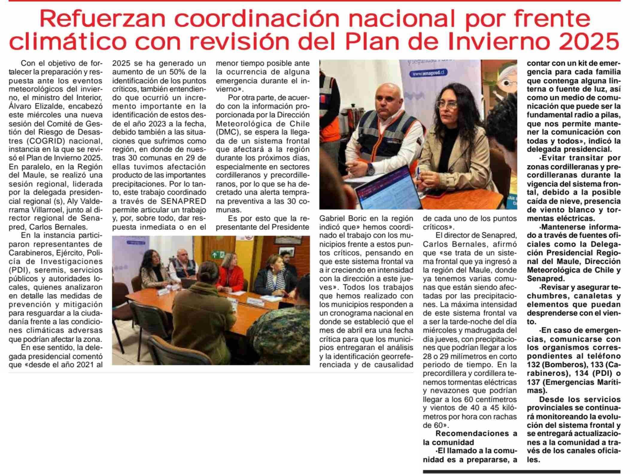 Refuerzan coordinación nacional por frente climático con revisión del Plan de Invierno 2025 08-05-2025 Maule Hoy |