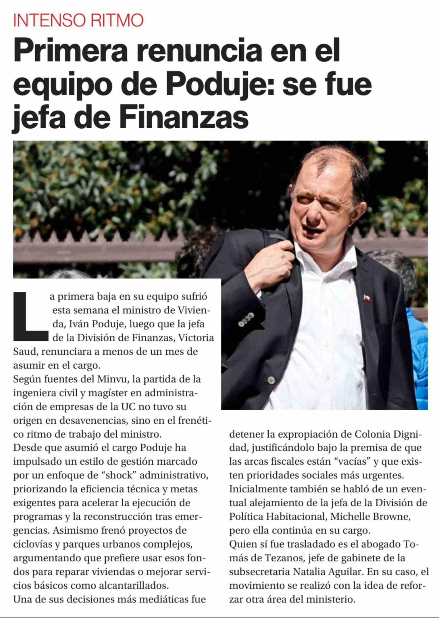 Primera renuncia en el equipo de Poduje: se fue jefa de Finanzas 10-04-2026 La Segunda |