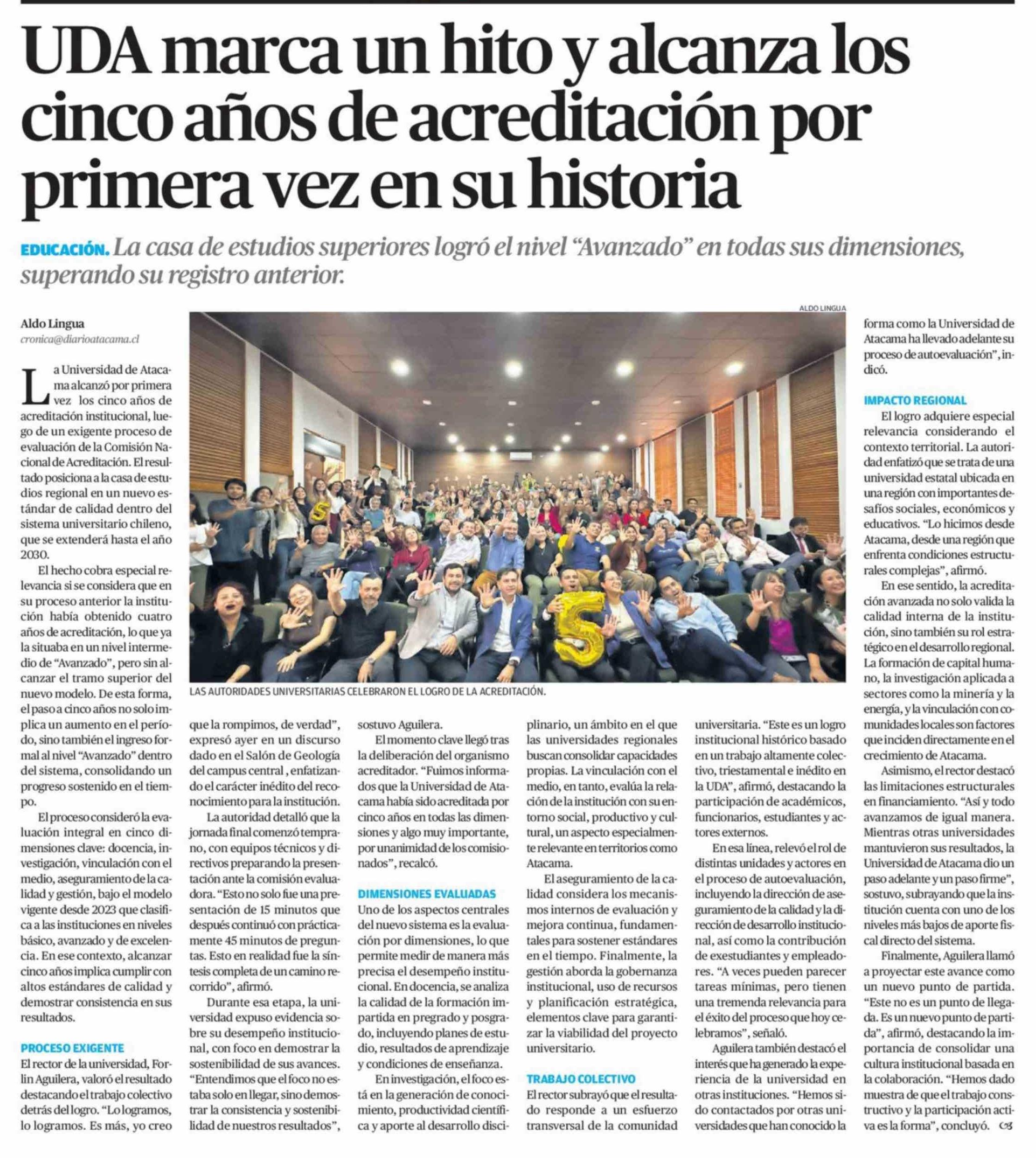 Título: UDA marca un hito y alcanza los cinco años de acreditación por primera vez en su historia
