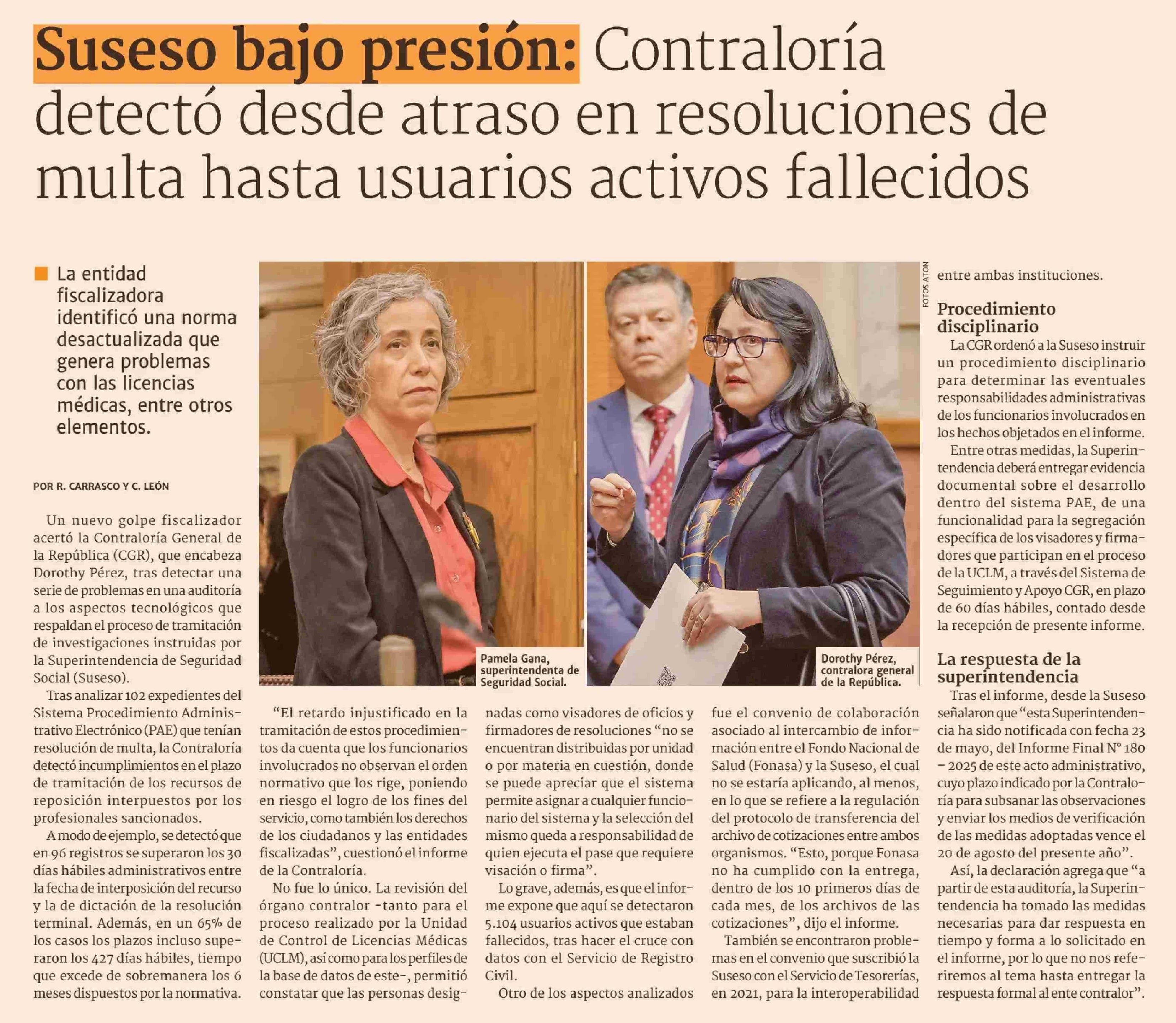 Suseso bajo presión: Contraloría detectó desde atraso en resoluciones de multa hasta usuarios activos fallecidos 11-06-2025 Diario Financiero |