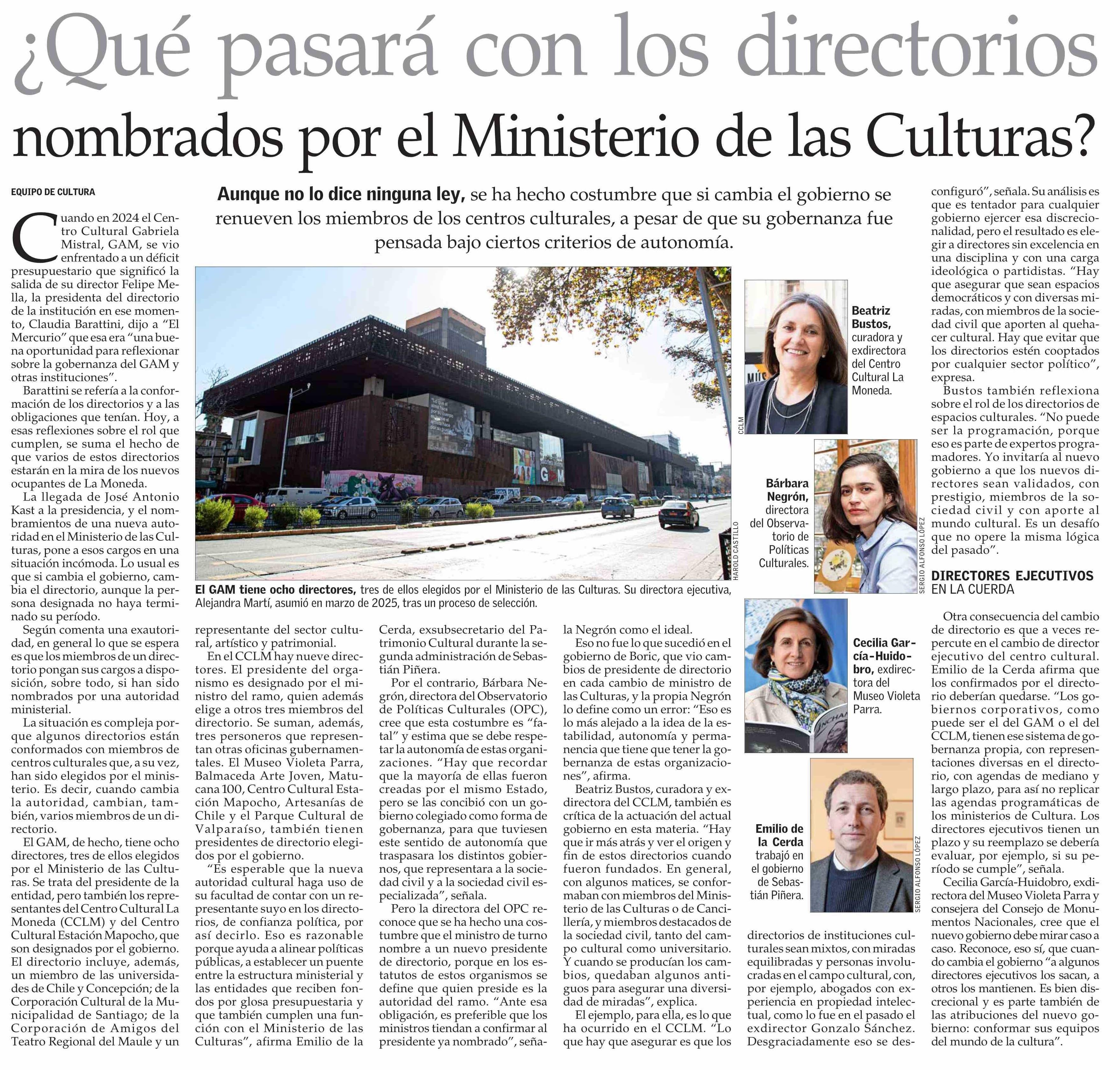 ¿Qué pasará con los directorios nombrados por el Ministerio de las Culturas? 15-01-2026 El Mercurio |