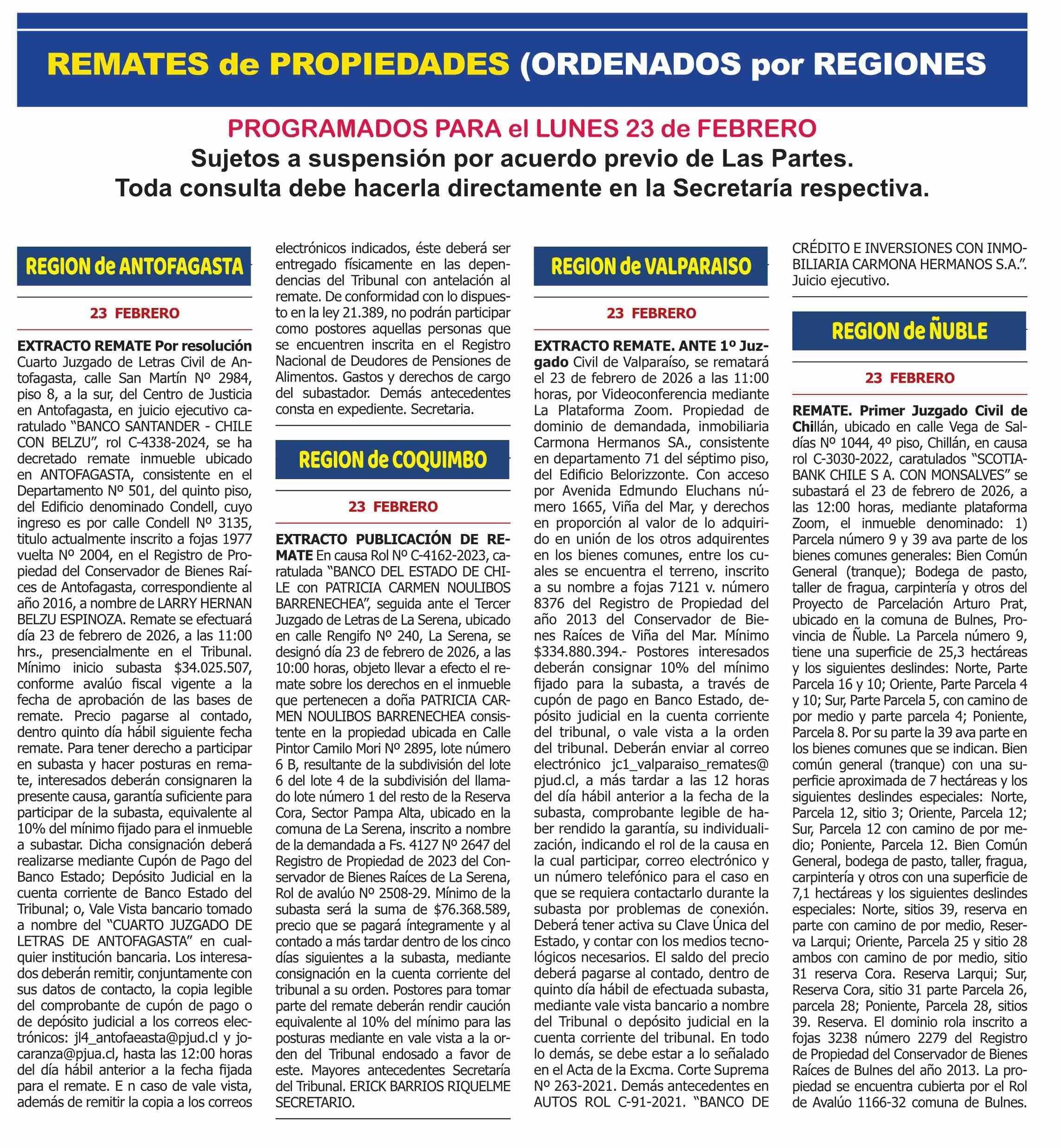 REMATES: REMATES de PROPIEDADES (ORDENADOS por REGIONES 16-02-2026 P&L Públicos y Legales |