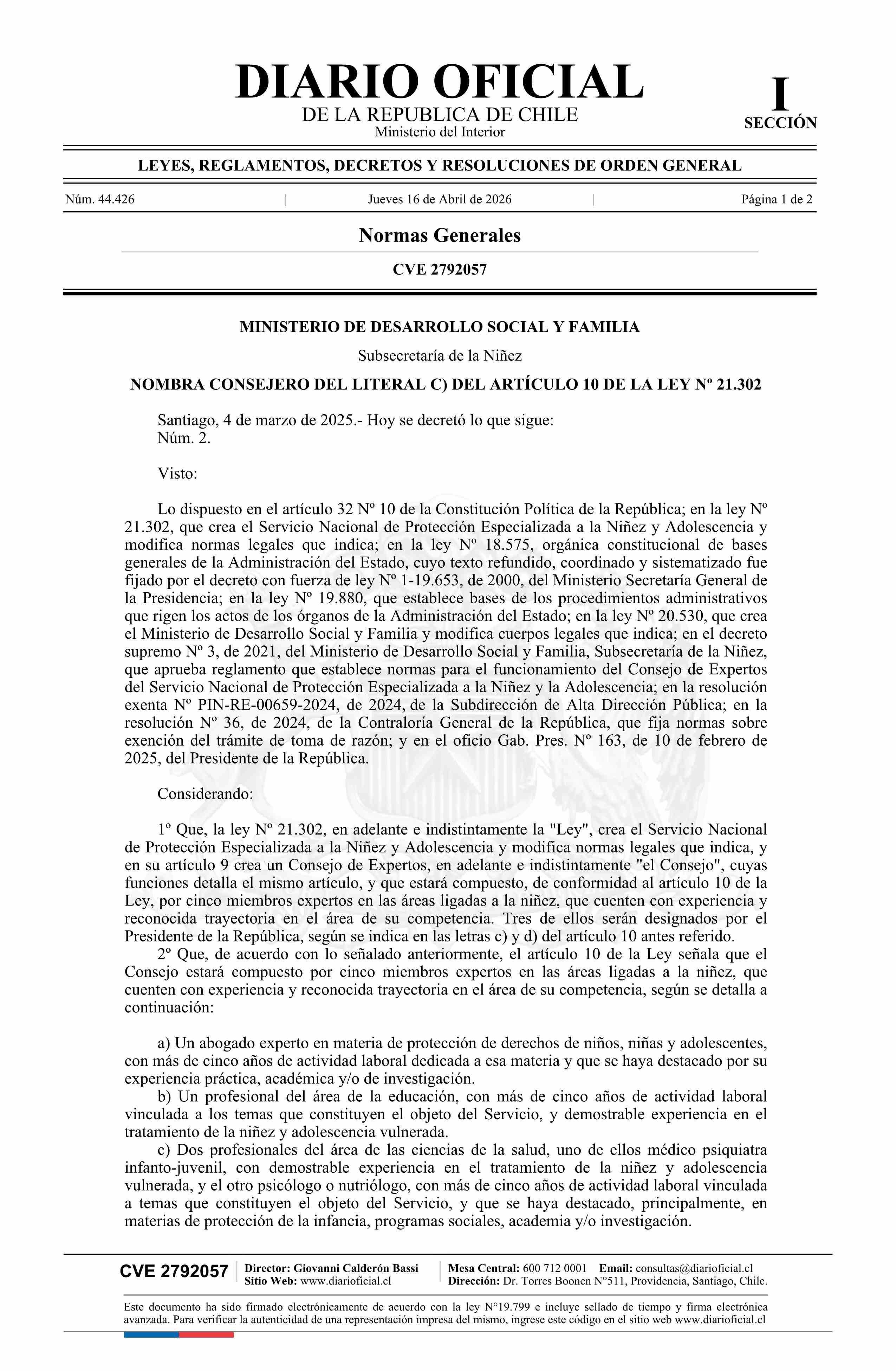 Decreto número 2, de 2025.- Nombra consejero del literal C) del artículo 10 de la ley Nº 21.302 16-04-2026 Diario Oficial Edición Electrónica |