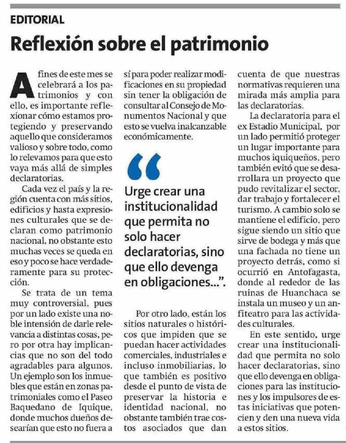 Editorial: Reflexión sobre el patrimonio 19-05-2025 La Estrella de Iquique |