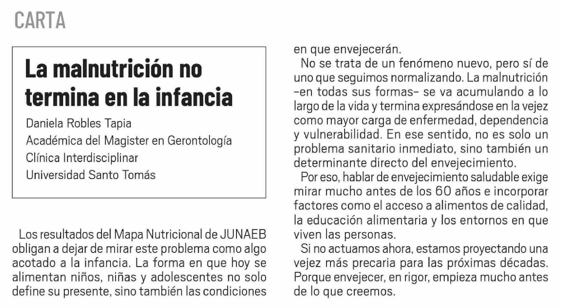 Título: Columnas de Opinión: Los resultados del Mapa Nutricional de JUNAEB obligan a dejar de mirar este problema como algo acotado a la infancia. La forma en que hoy se alimentan niños, niñas y adolescentes no solo define su presente, sino también las condiciones