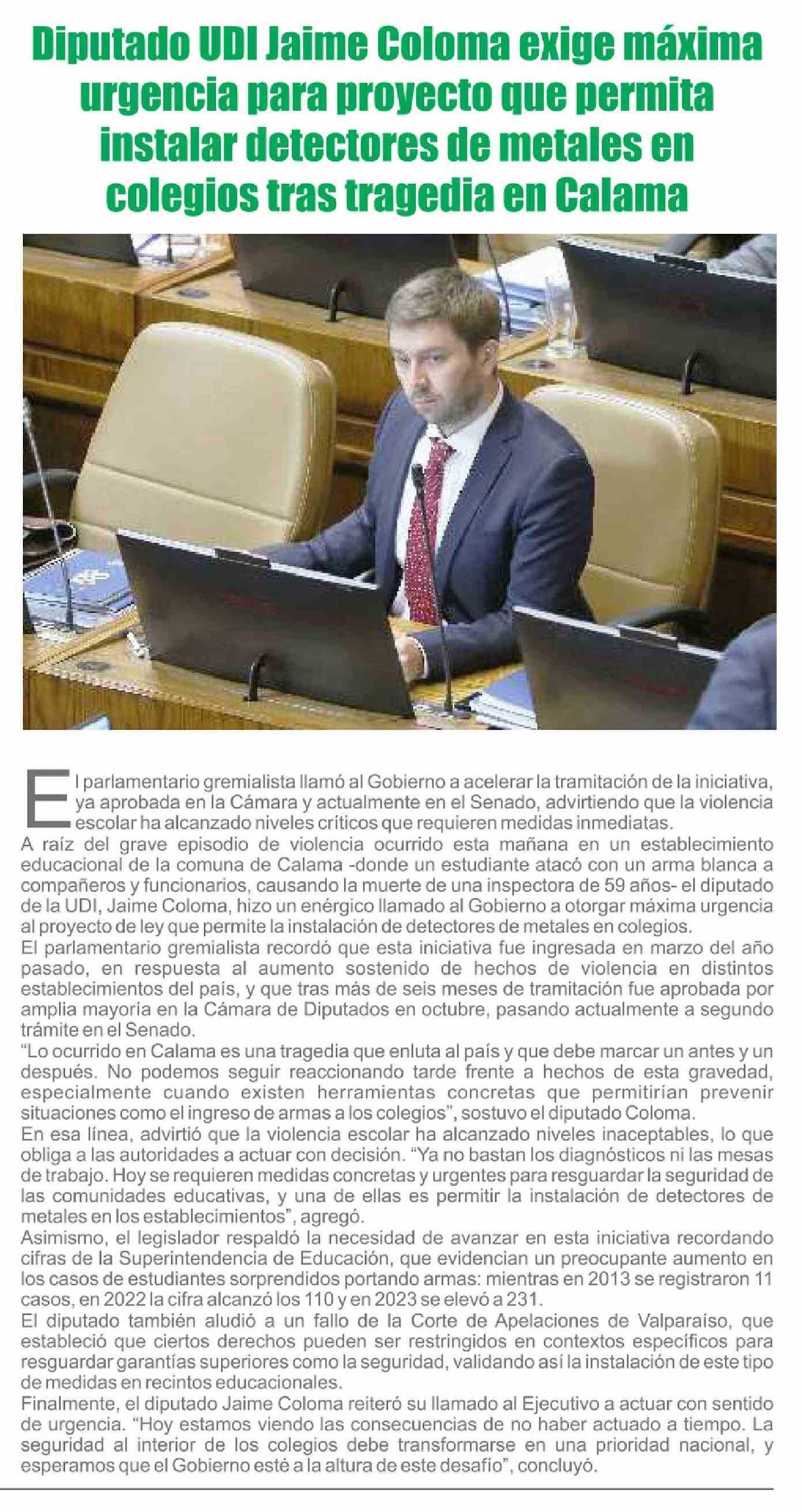 | Título: | Diputado UDI Jaime Coloma exige máxima urgencia para proyecto que permita instalar detectores de metales en colegios tras tragedia en Calama |