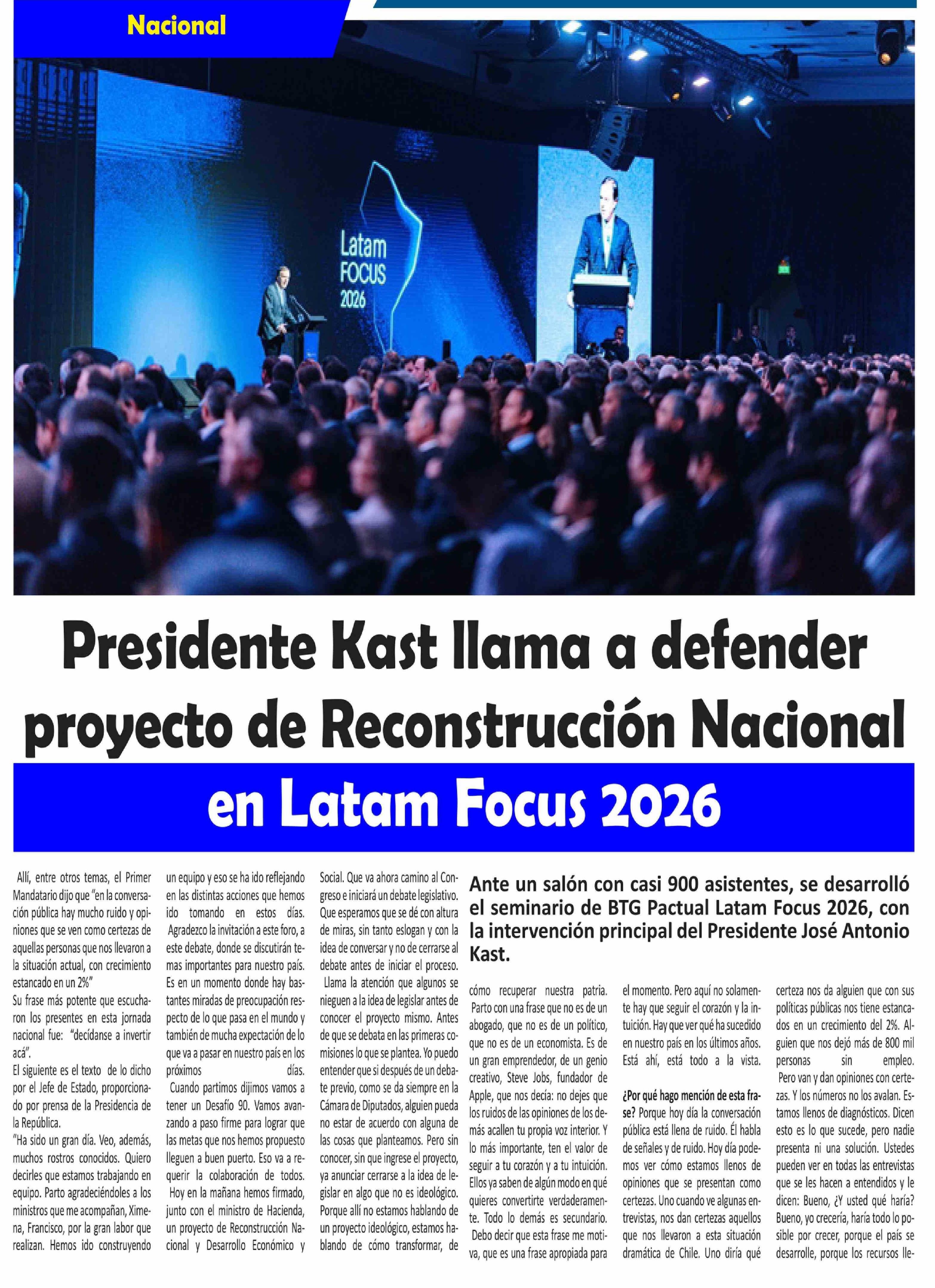 | Título: | Presidente Kast llama a defender proyecto de Reconstrucción Nacional en Latam Focus 2026 |