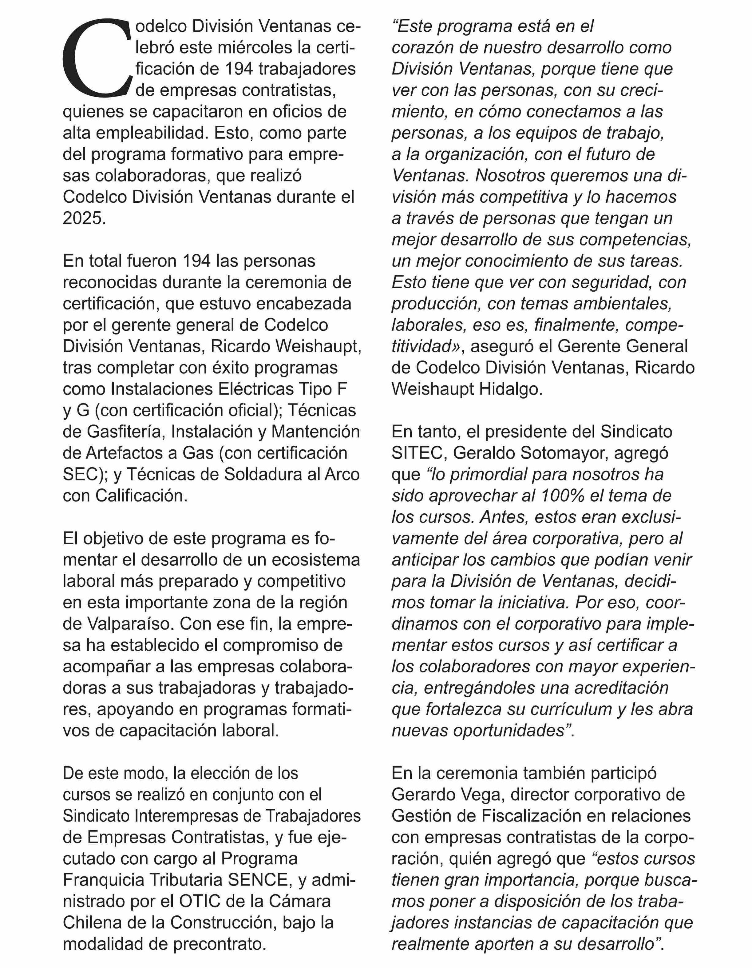 | Título: | Codelco División Ventanas certifica a 194 trabajadores de empresas contratistas en nuevas competencias técnicas |