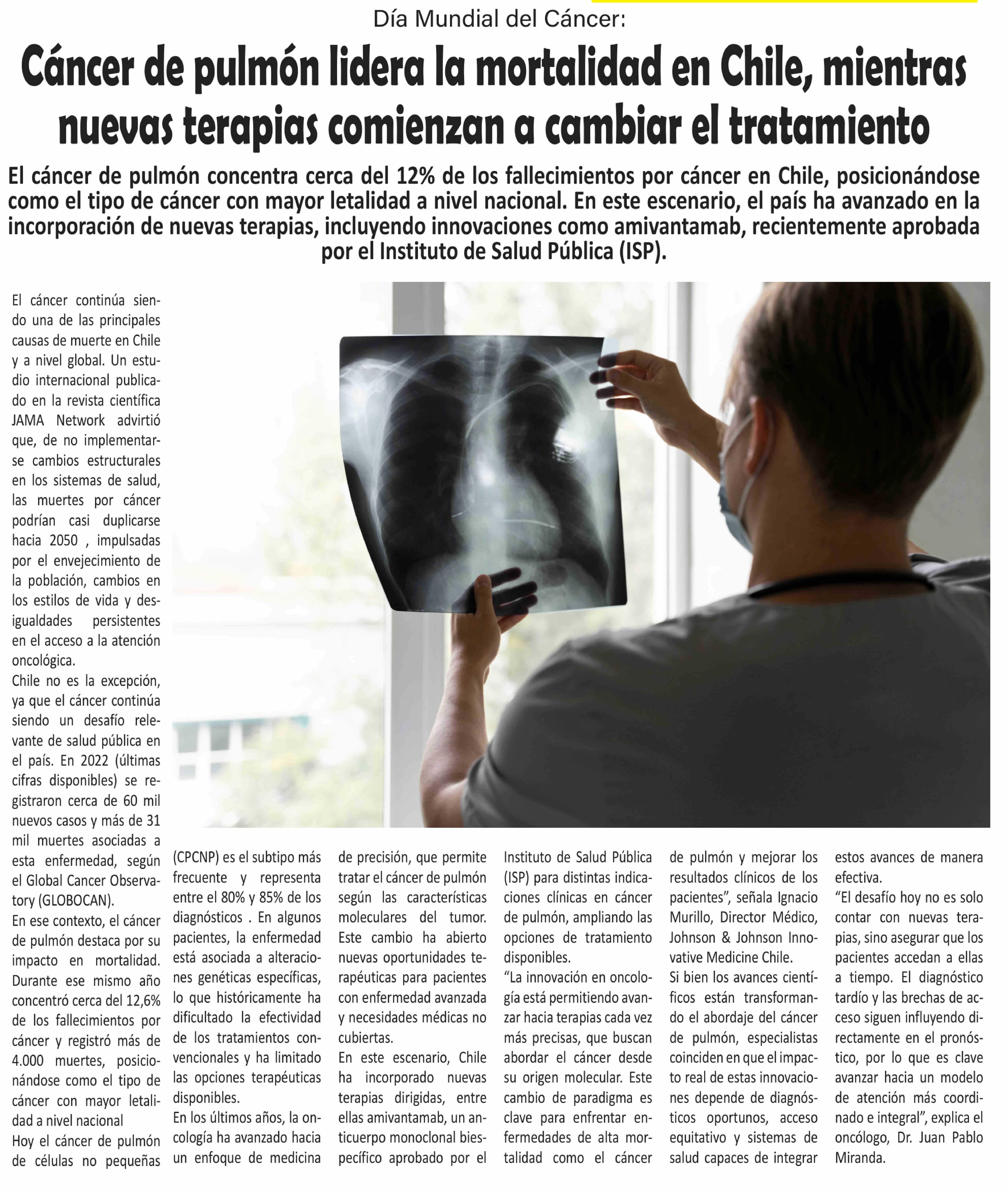 Cáncer de pulmón lidera la mortalidad en Chile, mientras nuevas terapias comienzan a cambiar el tratamiento 03-02-2026 El Longino |