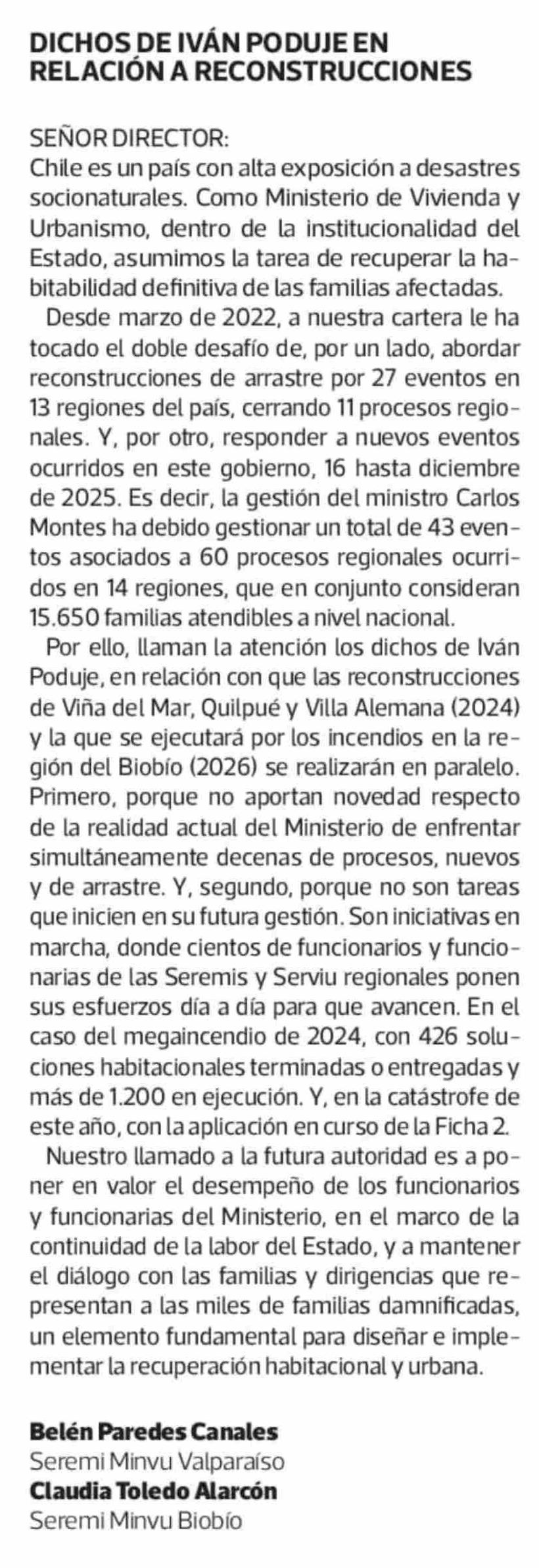 Cartas: DICHOS DE IVÁN PODUJE EN RELACIÓN A RECONSTRUCCIONES