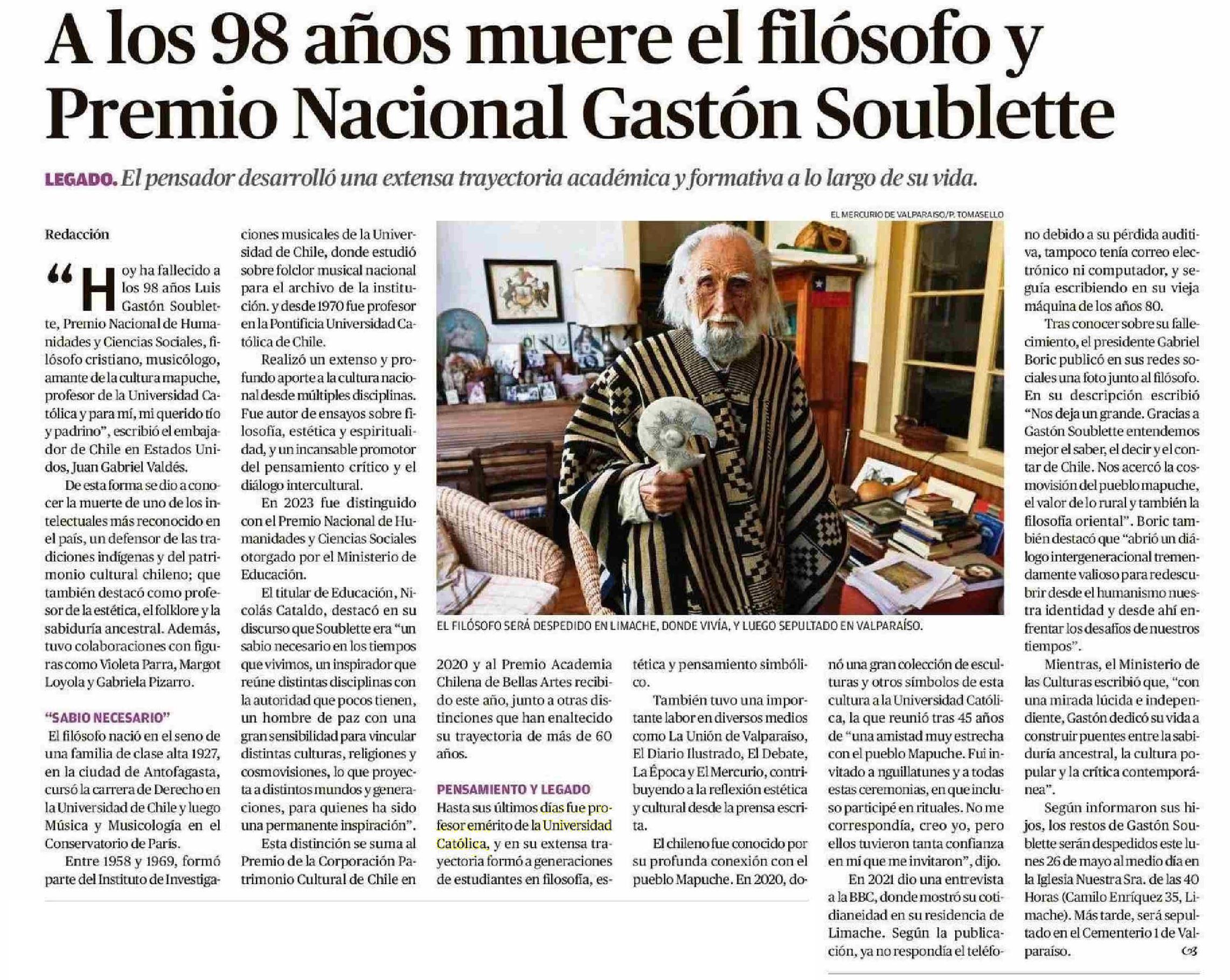 Alos 98 años muere el filósofo y Premio Nacional Gastón Soublette 26-05-2025 El Llanquihue |