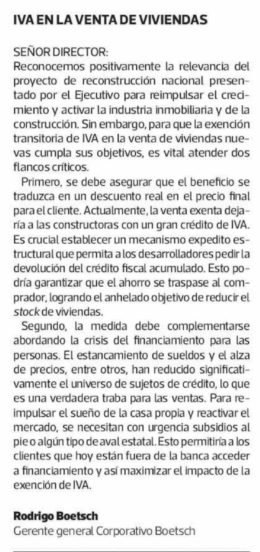 Cartas: IVA EN LA VENTA DE VIVIENDAS 28-04-2026 La Tercera |