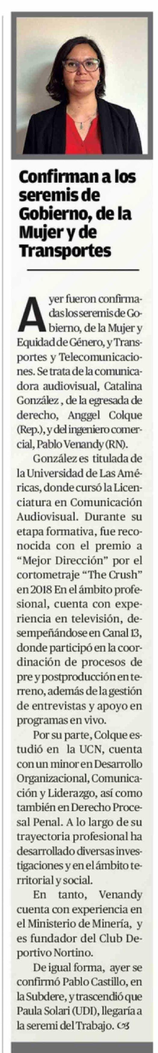 Confirman a los seremis de Gobierno, de la Mujer y de Transportes 01-04-2026 El Mercurio de Antofagasta |