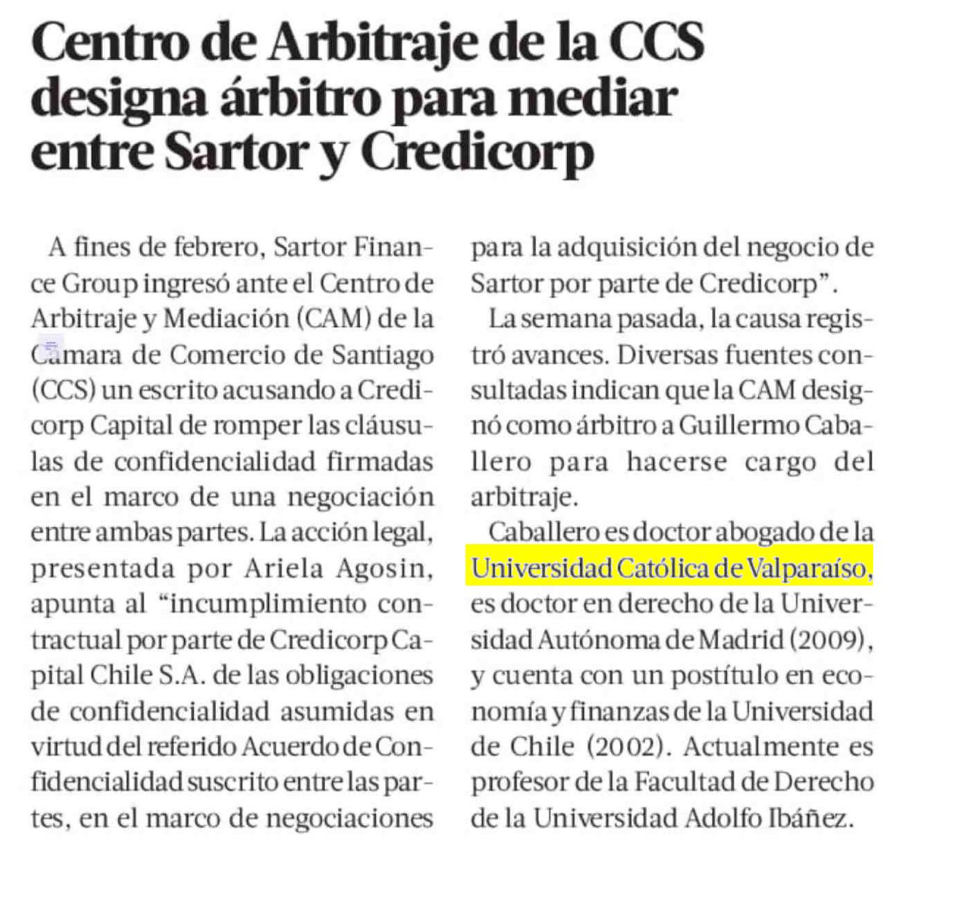 Centro de Arbitraje de la CCS designa árbitro para mediar entre Sartor y Credicorp 05-04-2025 La Tercera |