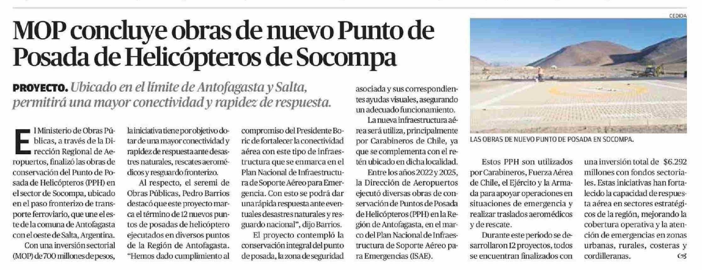 MOP concluye obras de nuevo Punto de Posada de Helicópteros de Socompa 25-01-2026 El Mercurio de Calama |