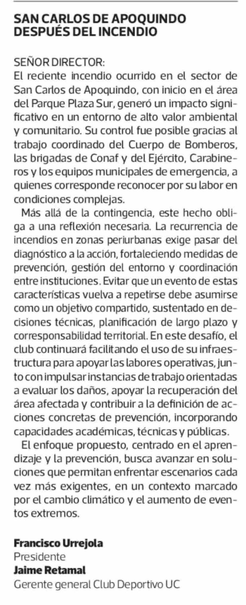 Cartas: SAN CARLOS DE APOQUINDO DESPUÉS DEL INCENDIO 09-01-2026 La Tercera |