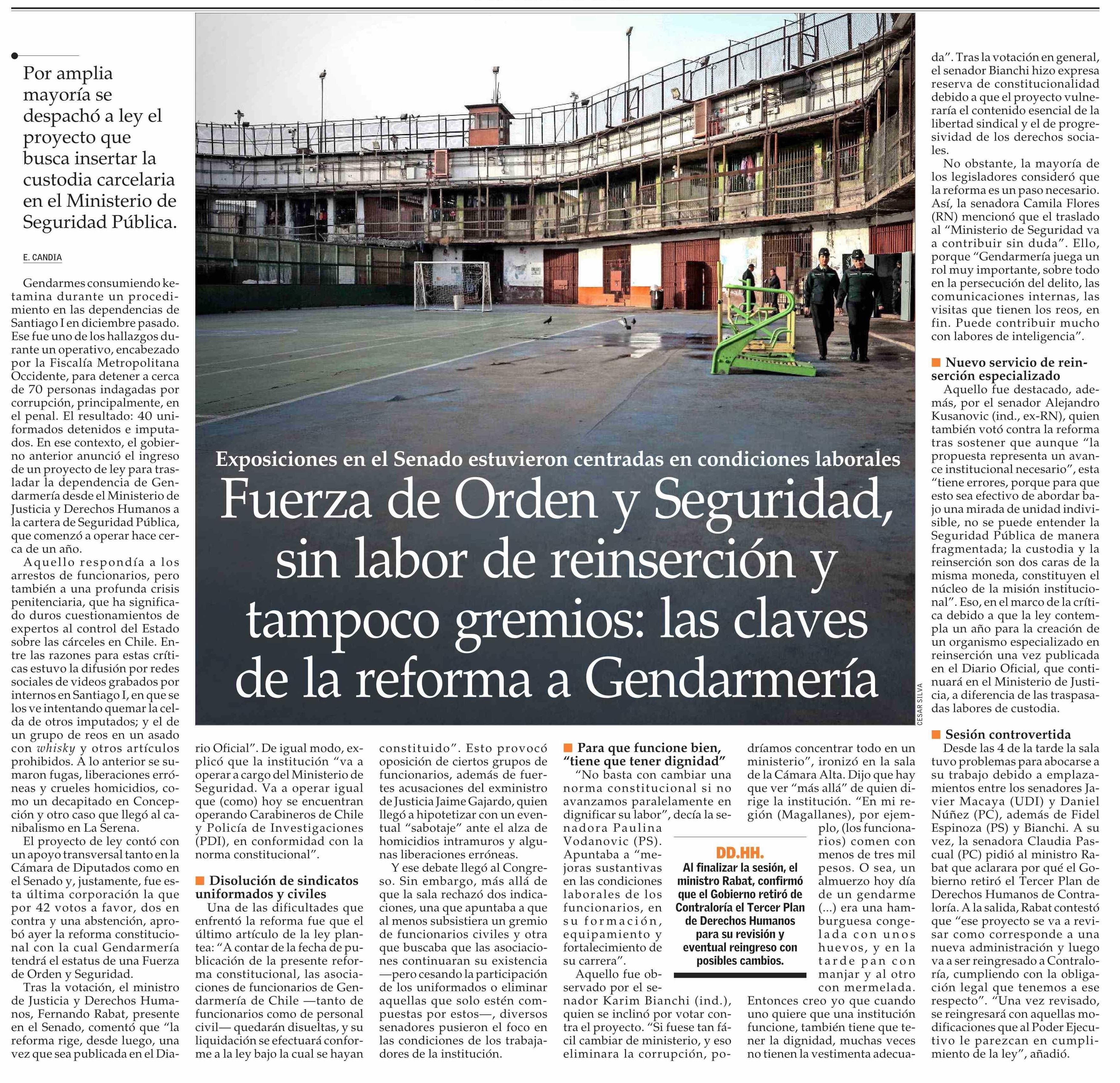 Fuerza de Orden y Seguridad, sin labor de reinserción y tampoco gremios: las claves de la reforma a Gendarmería 18-03-2026 El Mercurio |