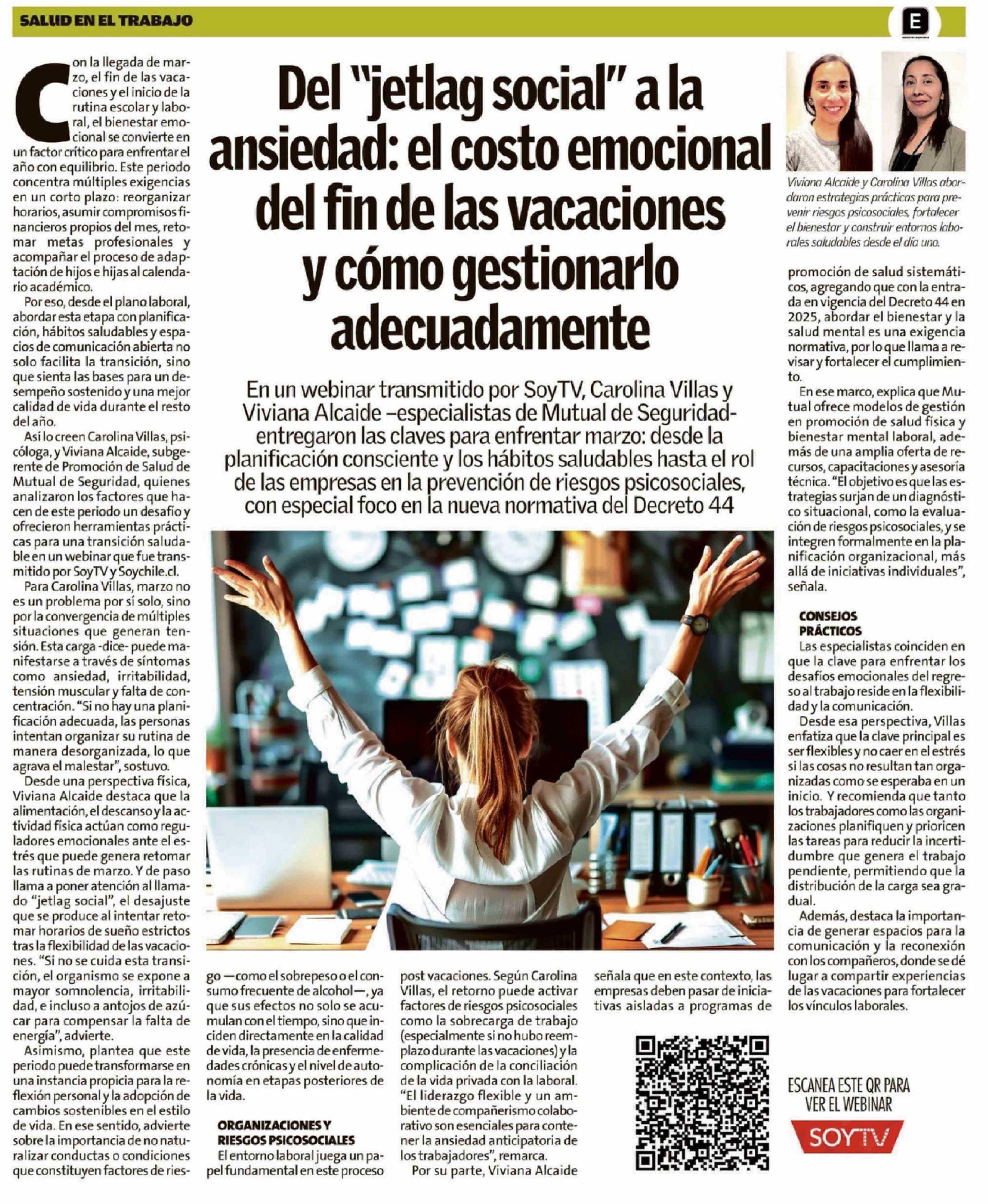 Del "jetlag social" a la ansiedad: el costo emocional del fin de las vacaciones y cómo gestionarlo adecuadamente 28-02-2026 Crónica de Chillán |