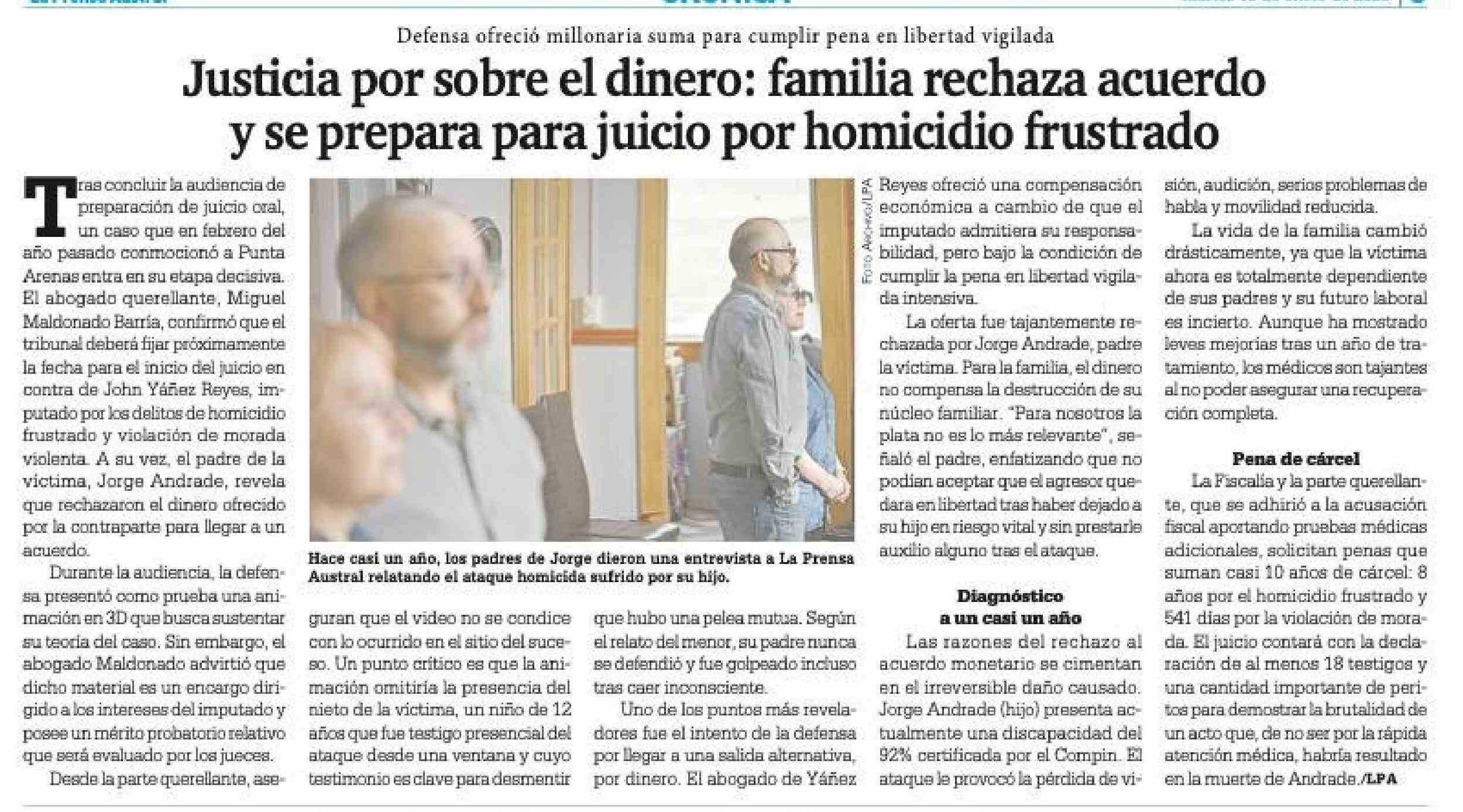 Justicia por sobre el dinero: familia rechaza acuerdo y se prepara para juicio por homicidio frustrado 13-01-2026 La Prensa Austral |