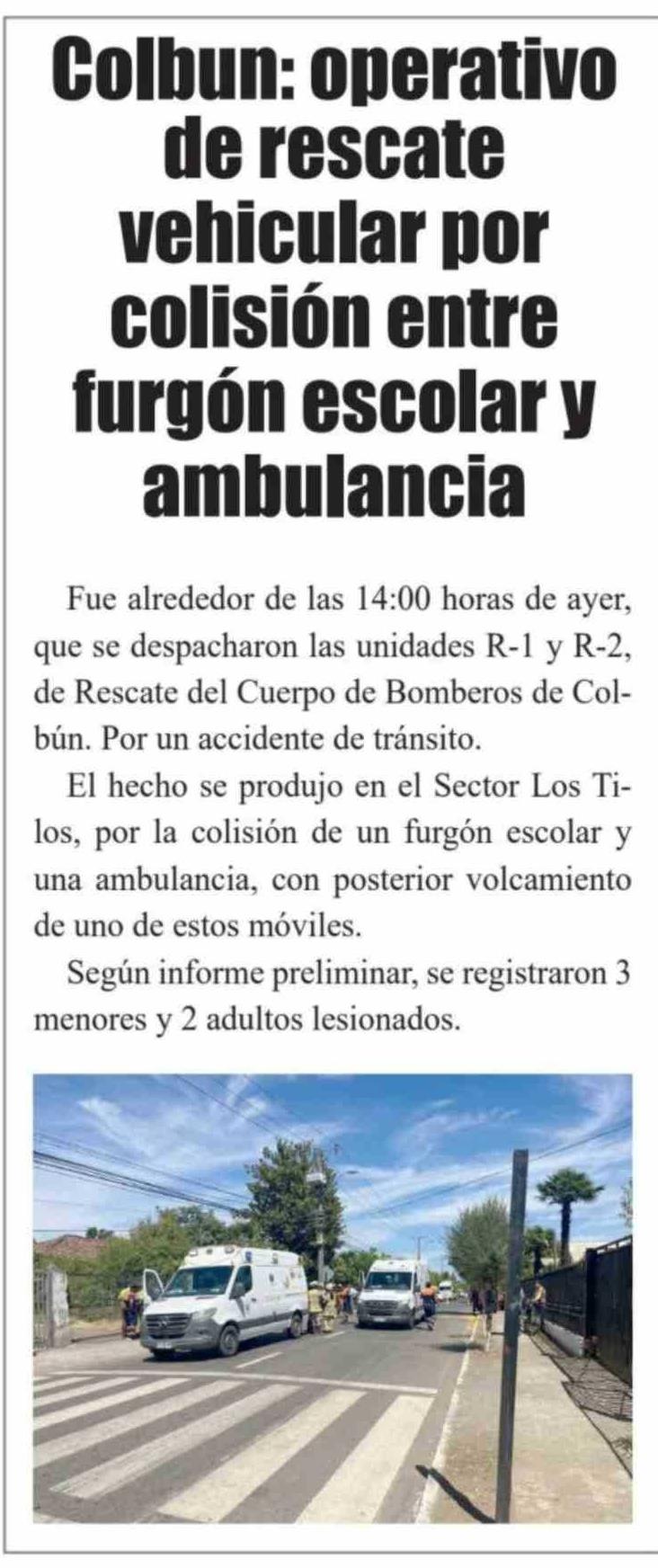 | Título: | Colbun: operativo de rescate vehicular por colisión entre furgón escolar y ambulancia |