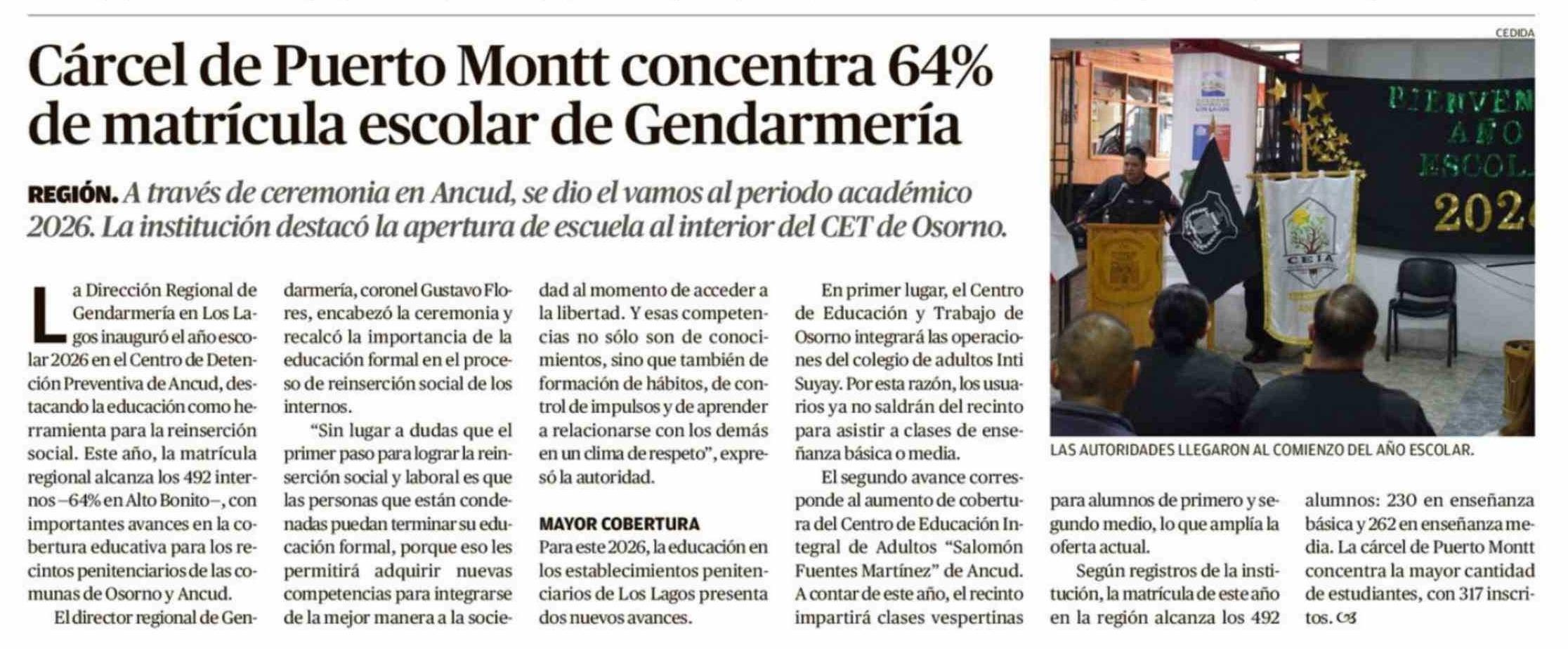 Cárcel de Puerto Montt concentra 64% de matrícula escolar de Gendarmería 09-04-2026 El Llanquihue |