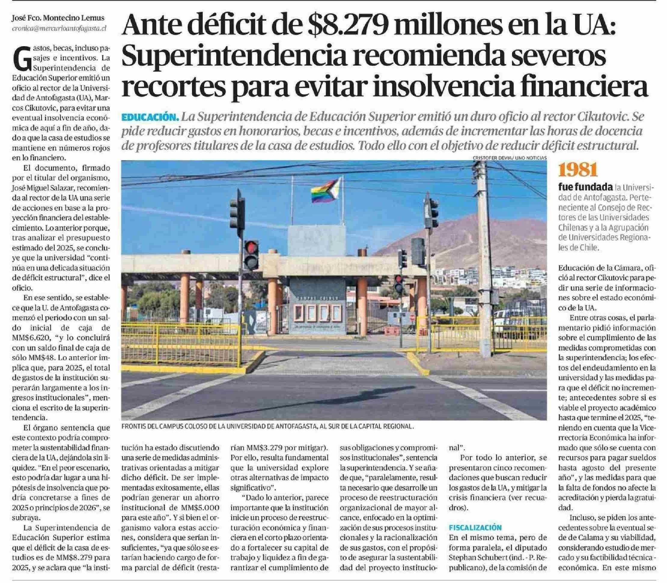 Ante déficit de $8.279 millones en la UA: Superintendencia recomienda severos recortes para evitar insolvencia financiera 05-06-2025 El Mercurio de Calama |