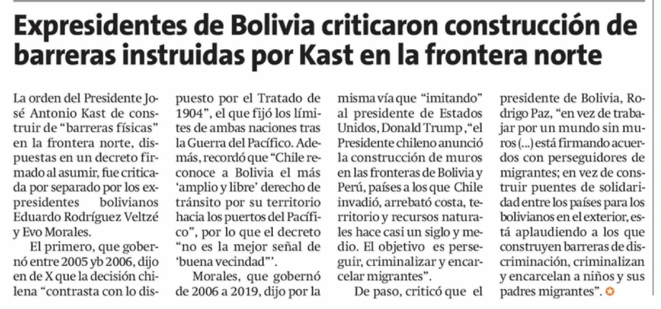 Título: Expresidentes de Bolivia criticaron construcción de barreras instruidas por Kast en la frontera norte