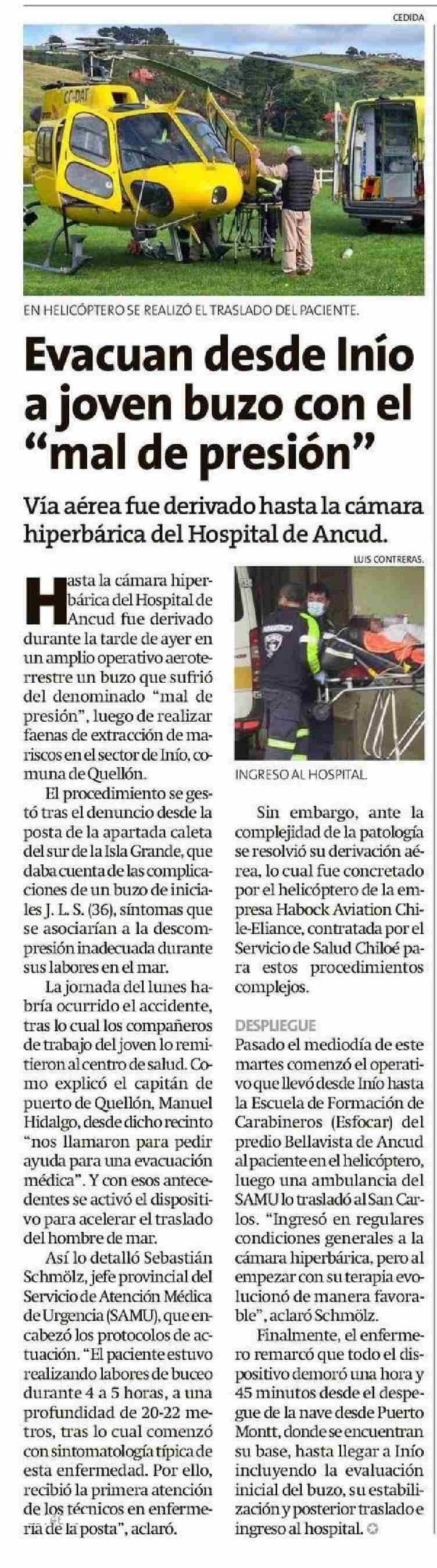 Evacuan desde Inío a joven buzo con el “mal de presión” 21-05-2025 La Estrella de Chiloé |